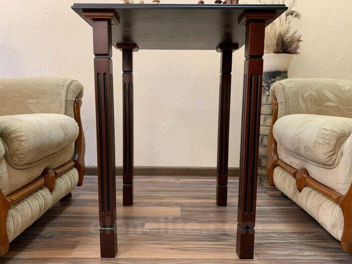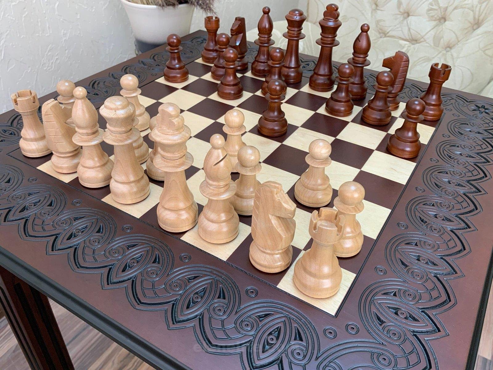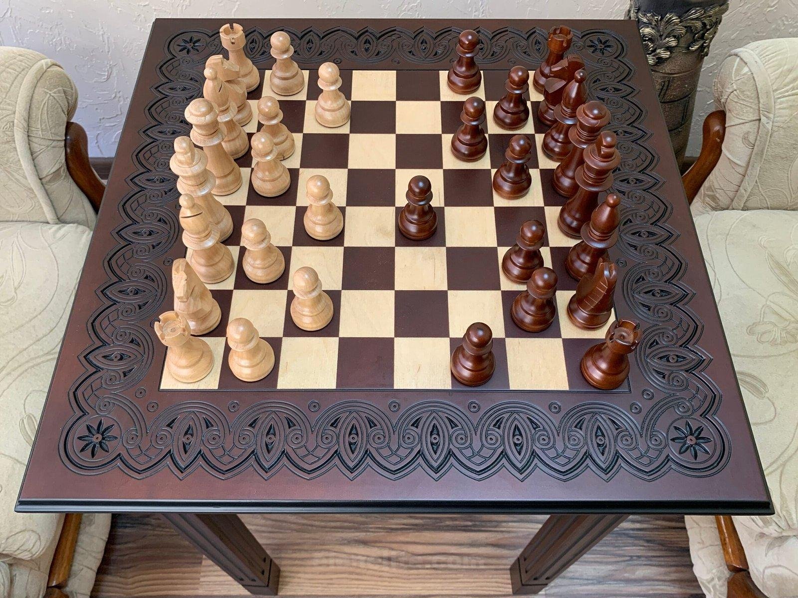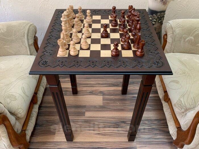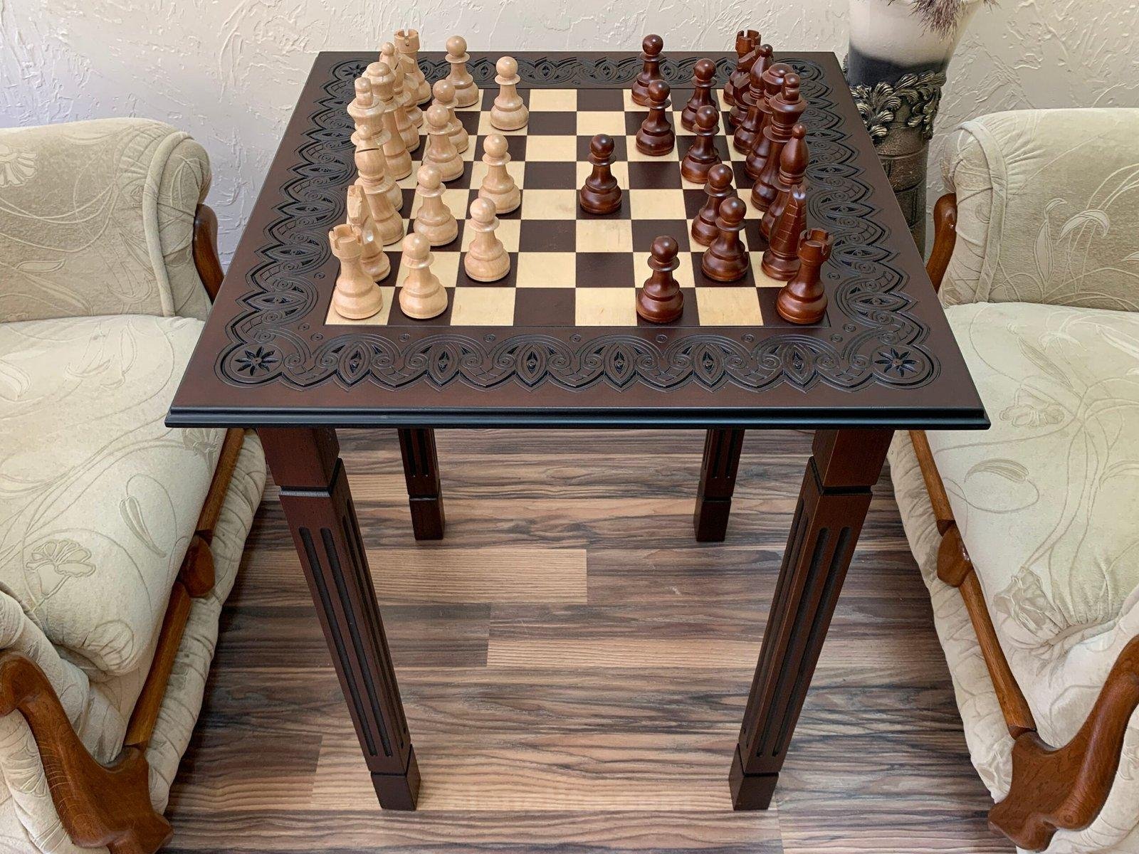 An elegant four-legged table crafted from premium dark brown ash with a carved game board. Sturdy and stylish, it comes complete with classic-style chess pieces.