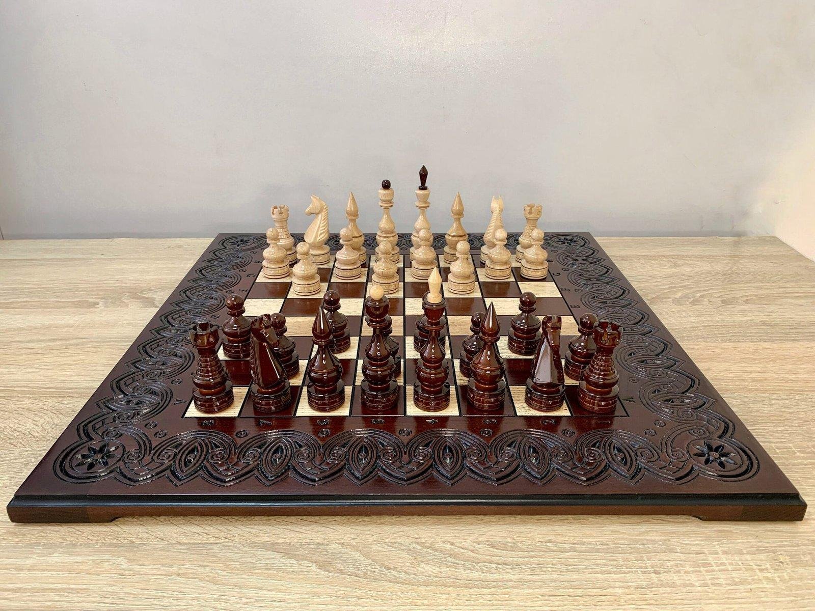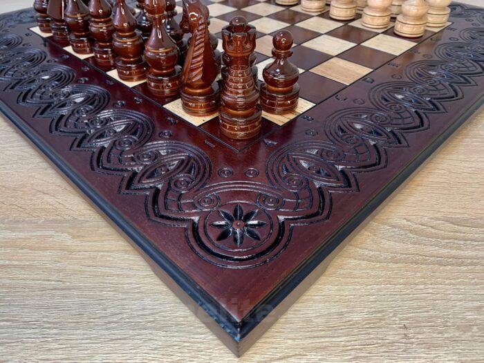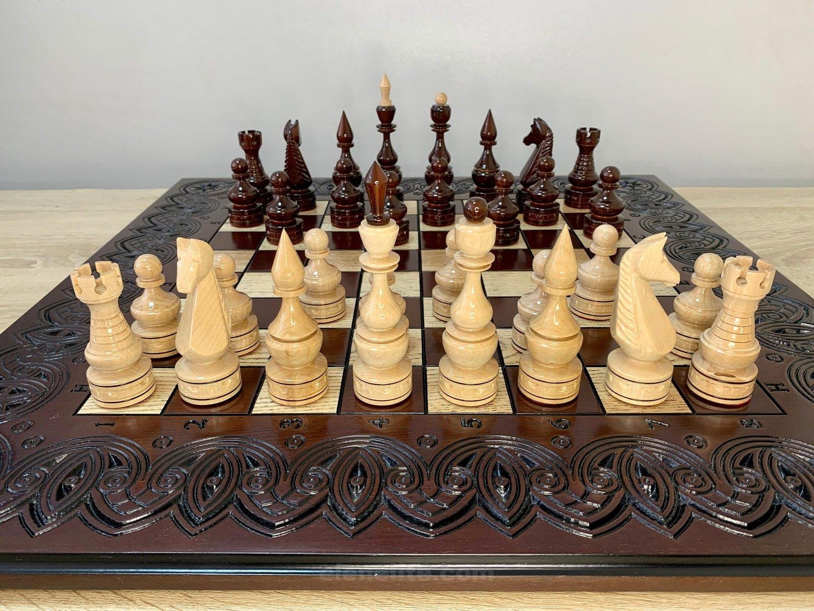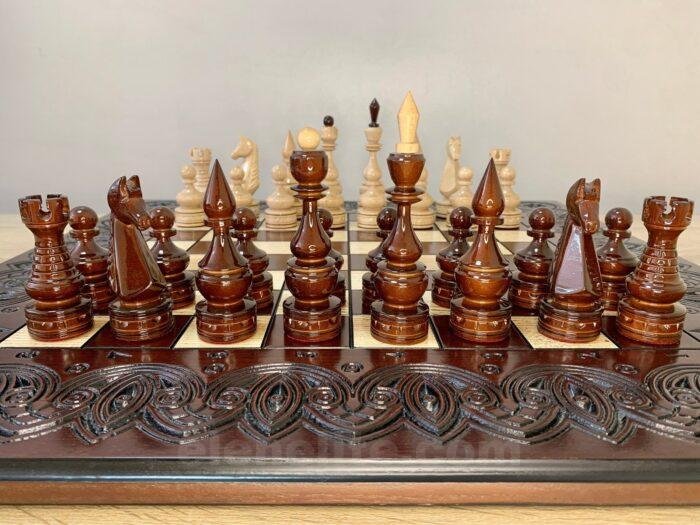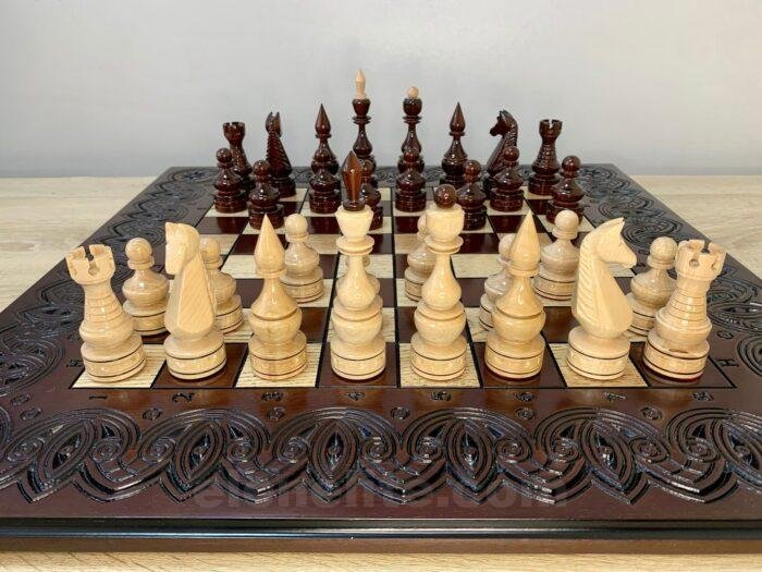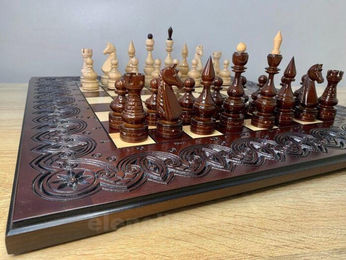 A premium chess set that combines classic aesthetics and expressive shine. The board is handcrafted from ash, painted dark brown and decorated with fine carvings in the form of an ornament along the entire perimeter.