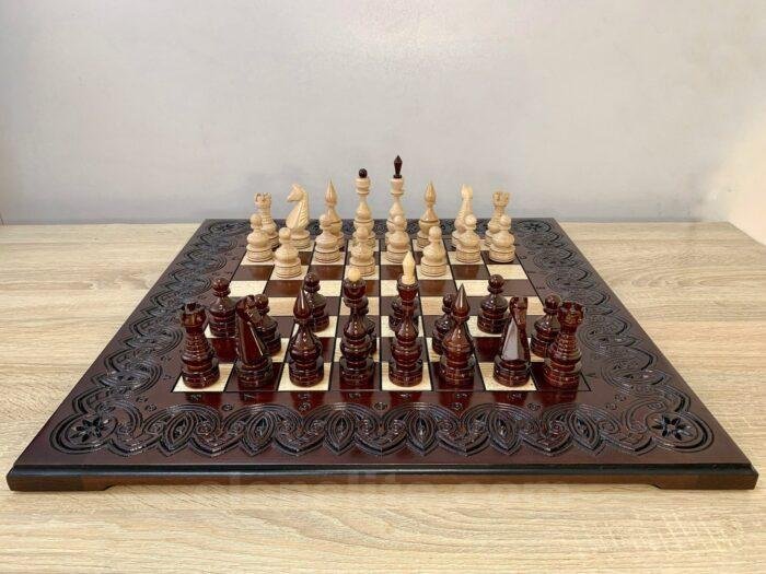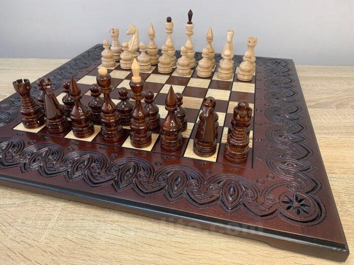 An elegant handcrafted chess set. The board is made of dark brown ash with a carved ornament along the edge. The pieces are made of maple in a classic design with a luxurious glossy finish that highlights the shape and details.