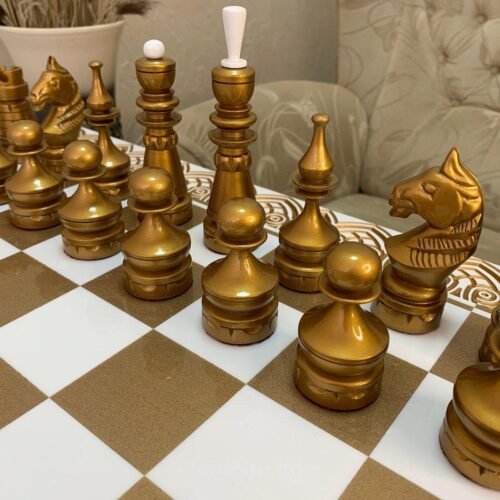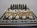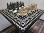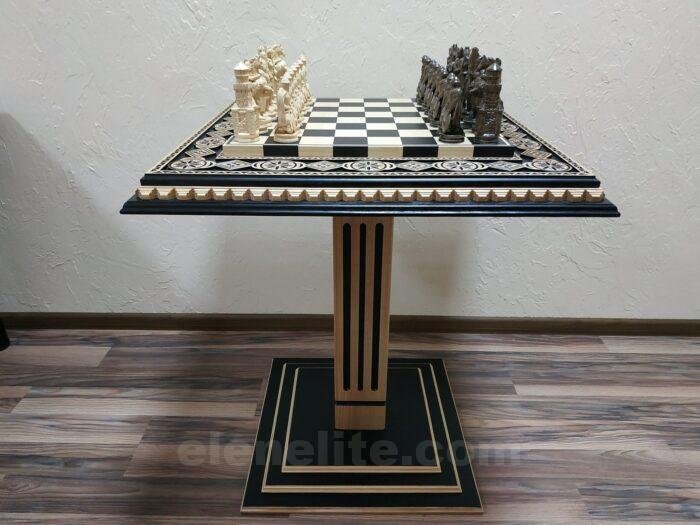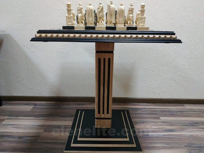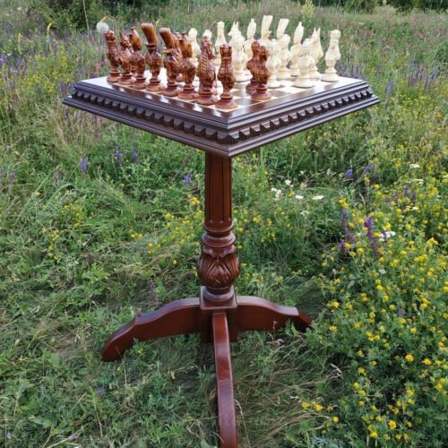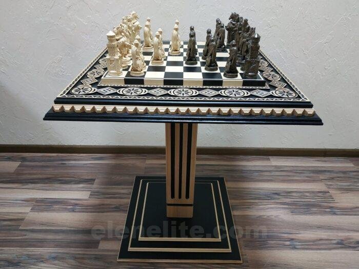 DESIGN: the chess board is decorated with carvings and beads; 32 chess pieces – Knights; exclusively designed by our “Elen Elite” craftsmen