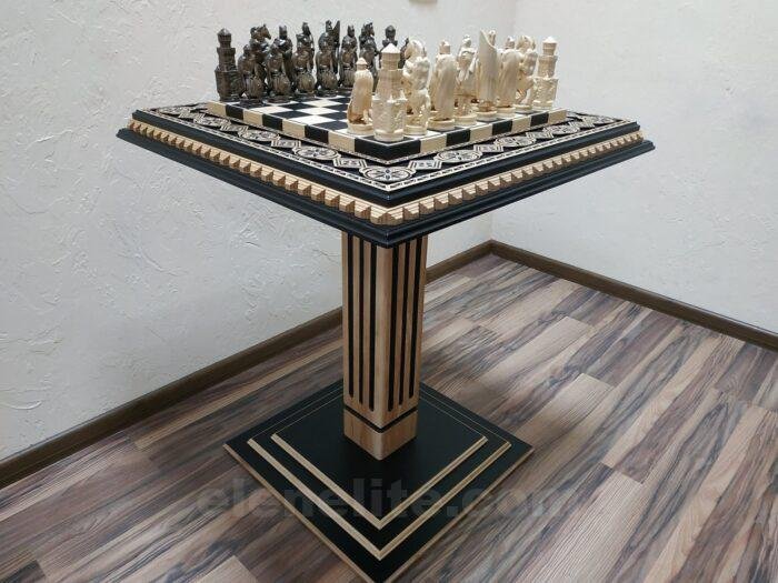 Introducing this exquisite chess set. The central element is a handcrafted table made of fine ash. Its surface is painted black, while the light carvings with decorative beads highlight the wood grain and create a striking contrast. The set is completed with knight-shaped chess pieces, each crafted with exquisite detail. This set will complement any interior.
