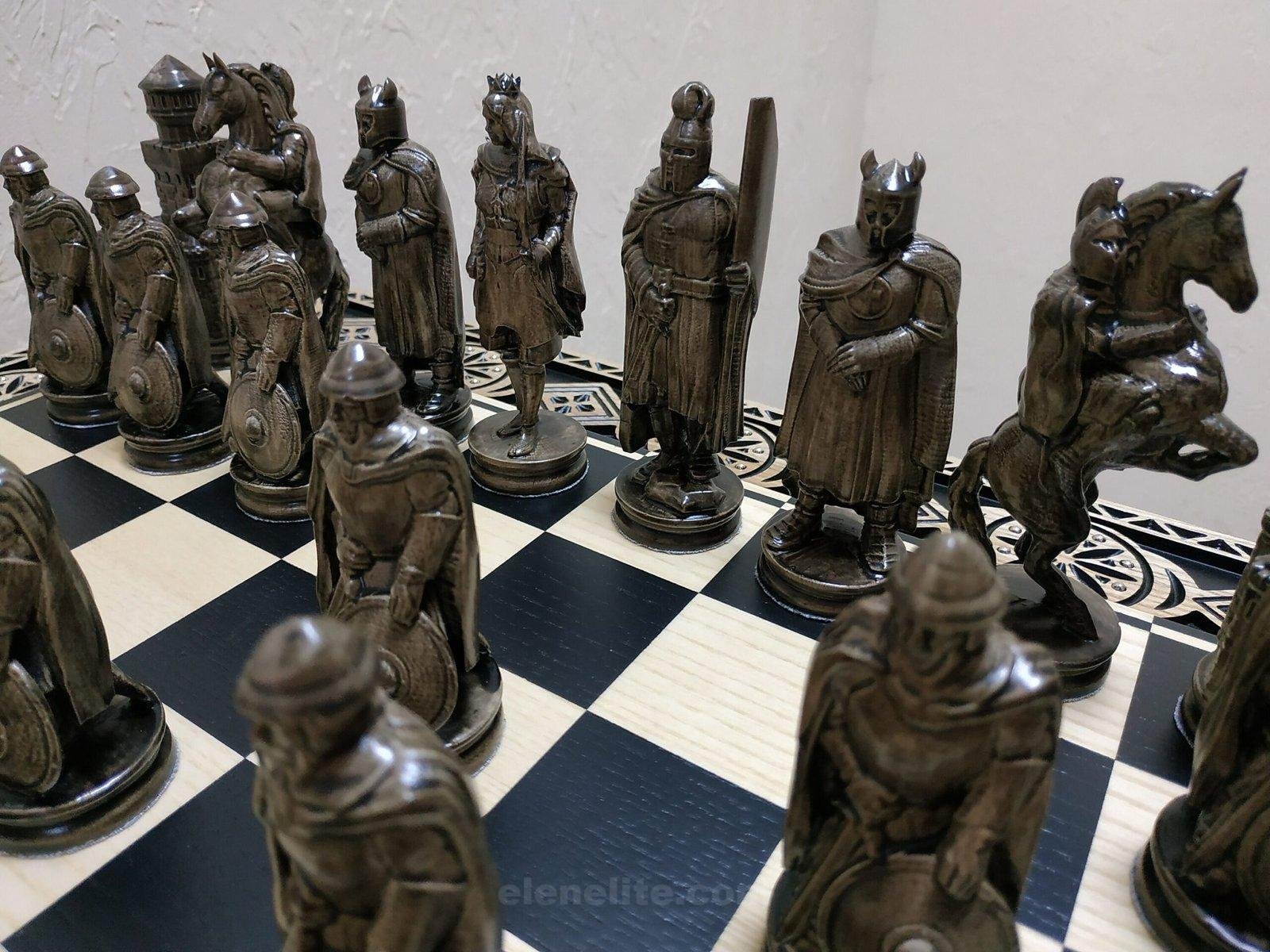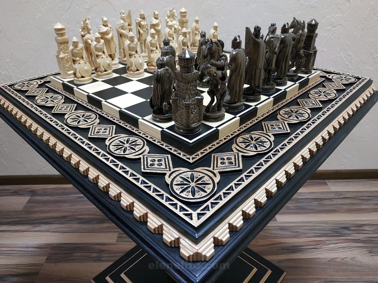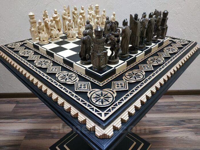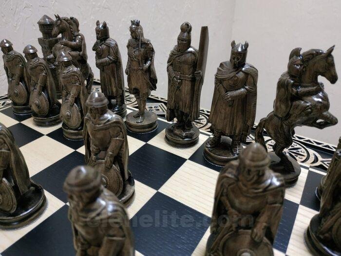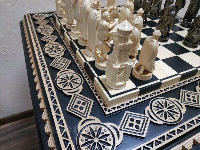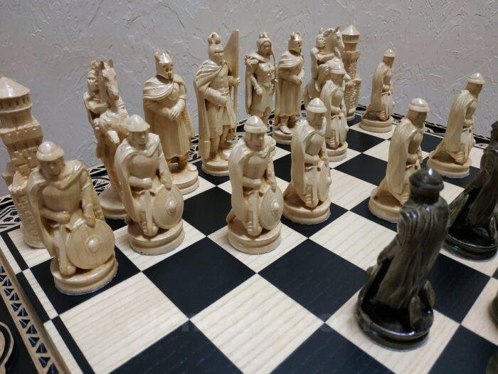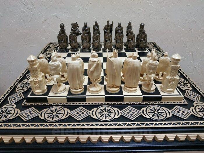 We present to your attention an exclusive handmade chess set of high quality and unique design. The chess board is made of ash. The deep black color gives it solidity, and the contrasting light carving on the entire surface emphasizes the craftsmanship of handwork. The bead inlay gives the board a special elegance, creating a unique decorative accent. The chess pieces are made of maple and have an original author’s design in the style of medieval knights. Each piece is handcrafted: swords, shields, clothing elements – everything is made with the highest detail.