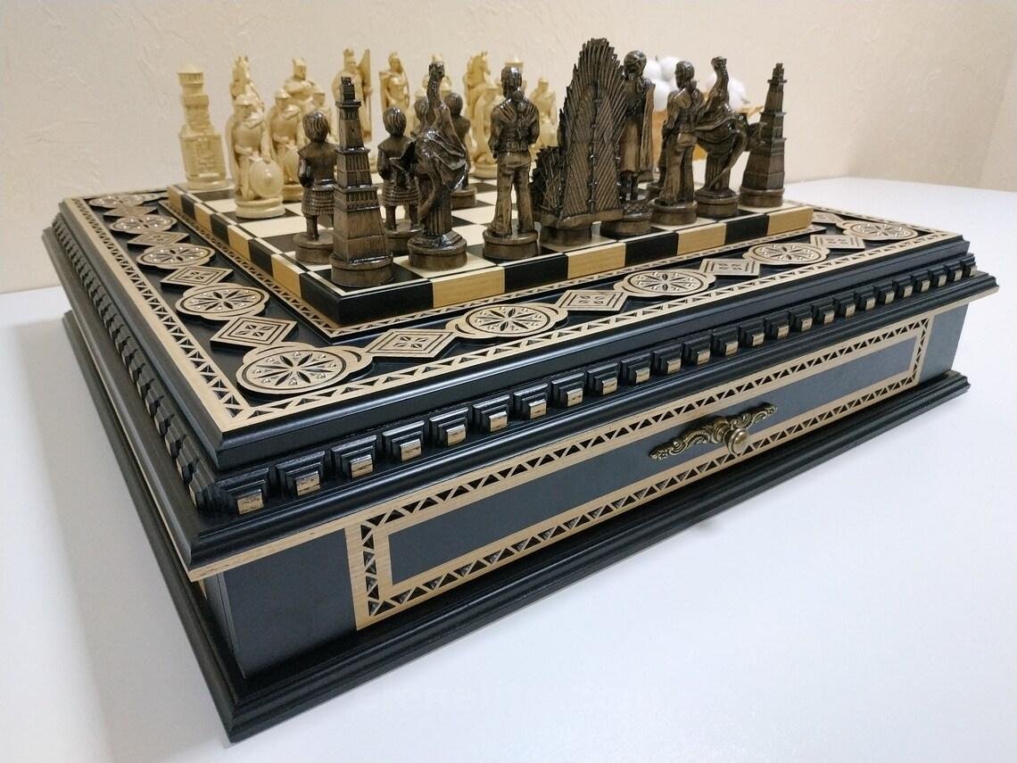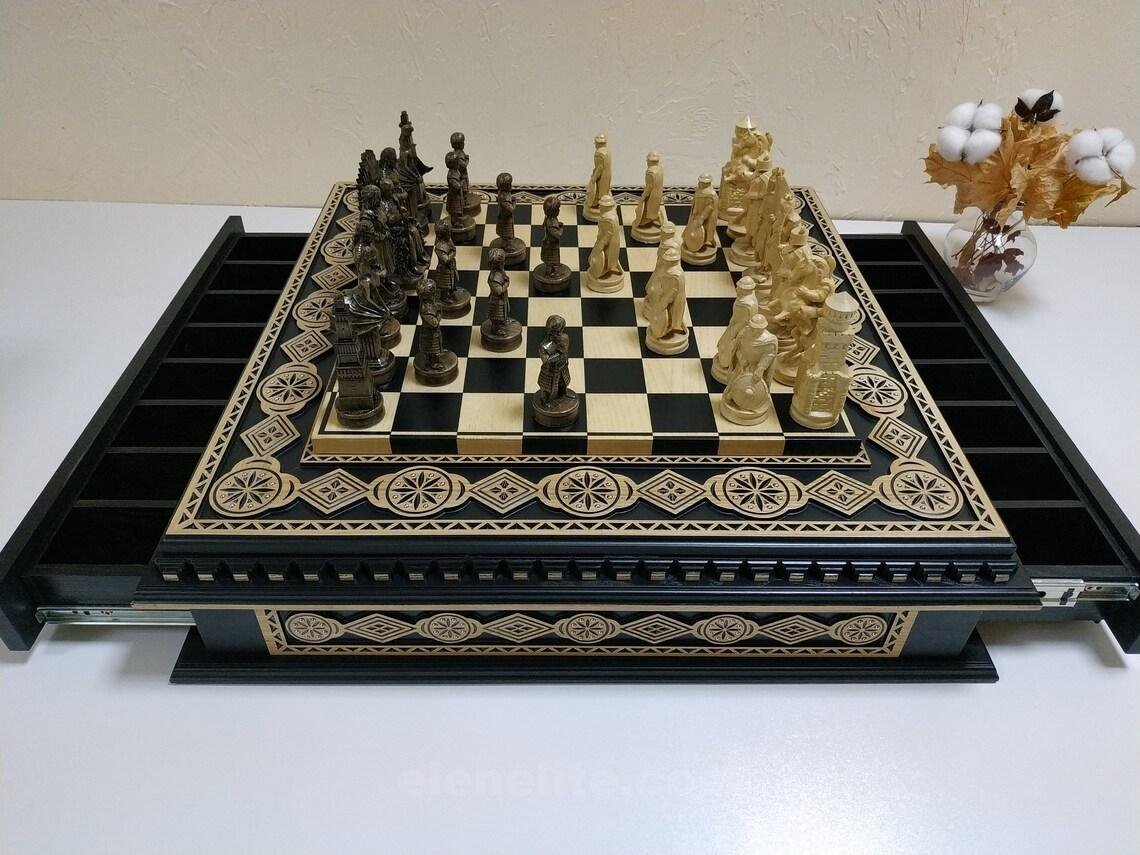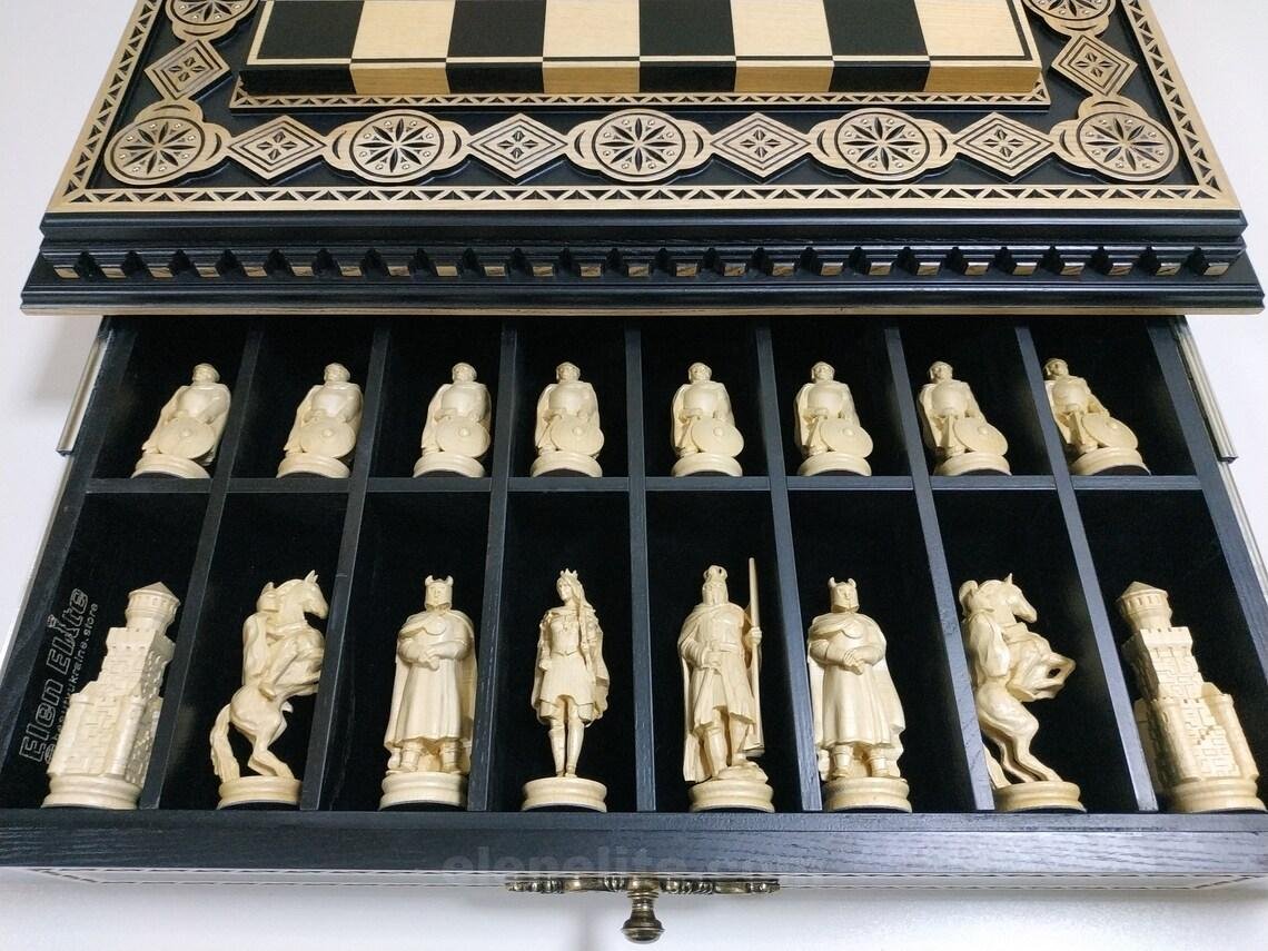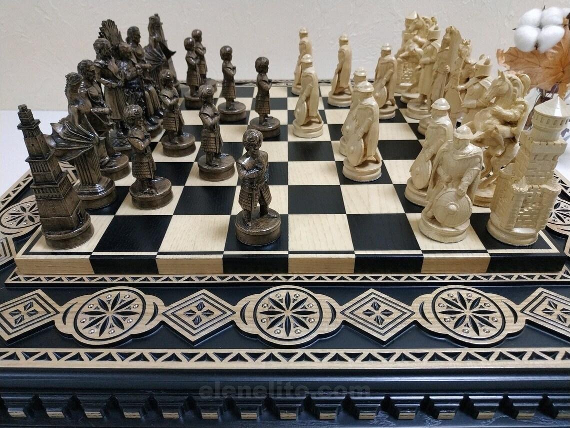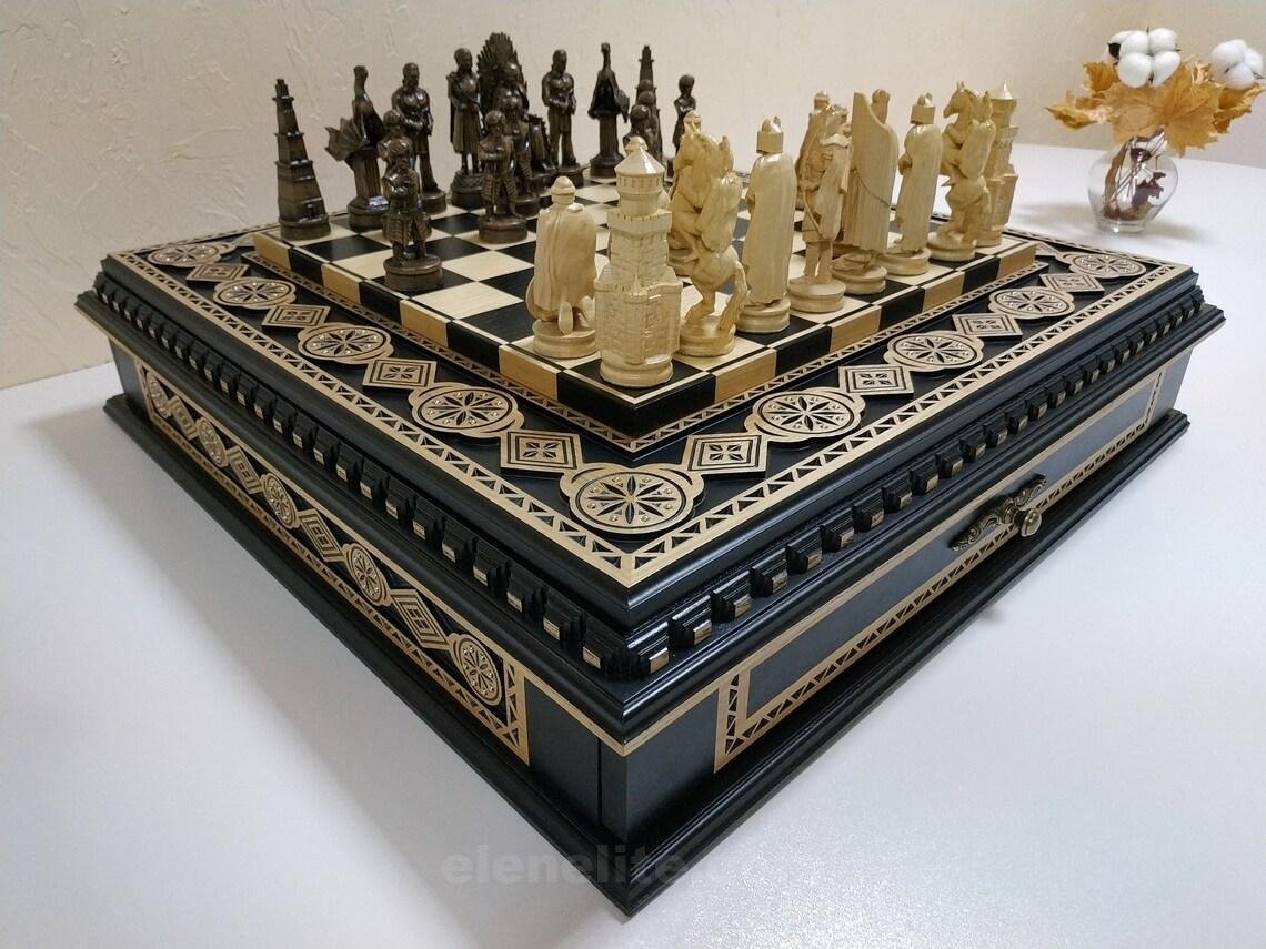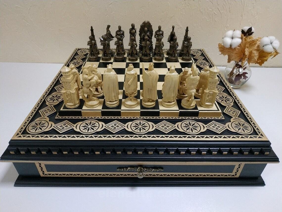 A handcrafted ash chessboard with carvings and decorative inlays. It features two velvet-lined drawers. The chess set includes 32 pieces: 16 – “Battle of Thrones”- themed and 16 medieval Knights.