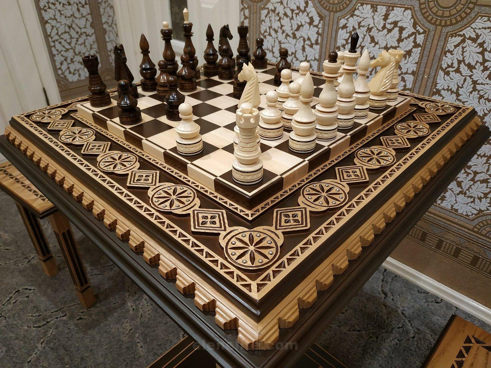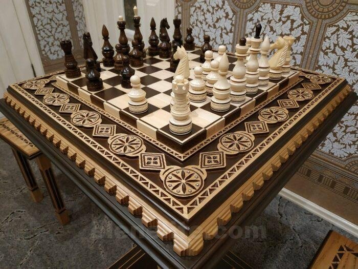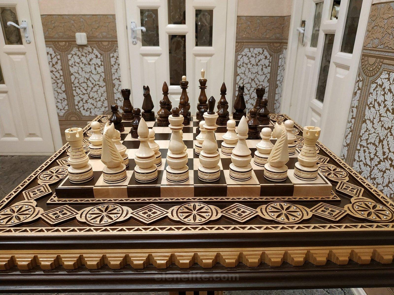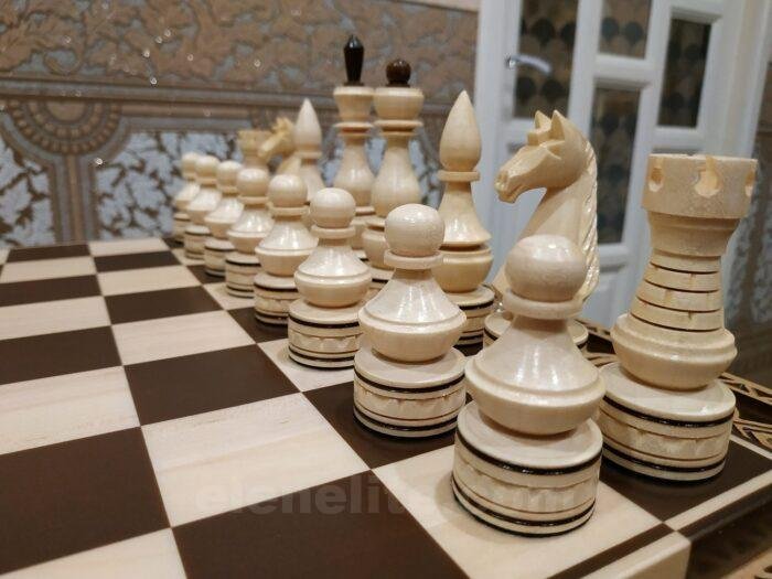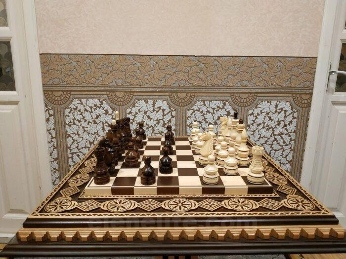 This chess set combines the traditions of classic design and handcrafted craftsmanship. The board is made of durable ash, painted in a warm brown shade, which beautifully emphasizes the natural structure of the wood. Light-colored carvings running across the entire surface add expressiveness, and decorative bead inlay makes the product unique and aesthetic. The pieces are handmade from maple and are designed in a classic style. The set will be a worthy interior decoration or an original gift.