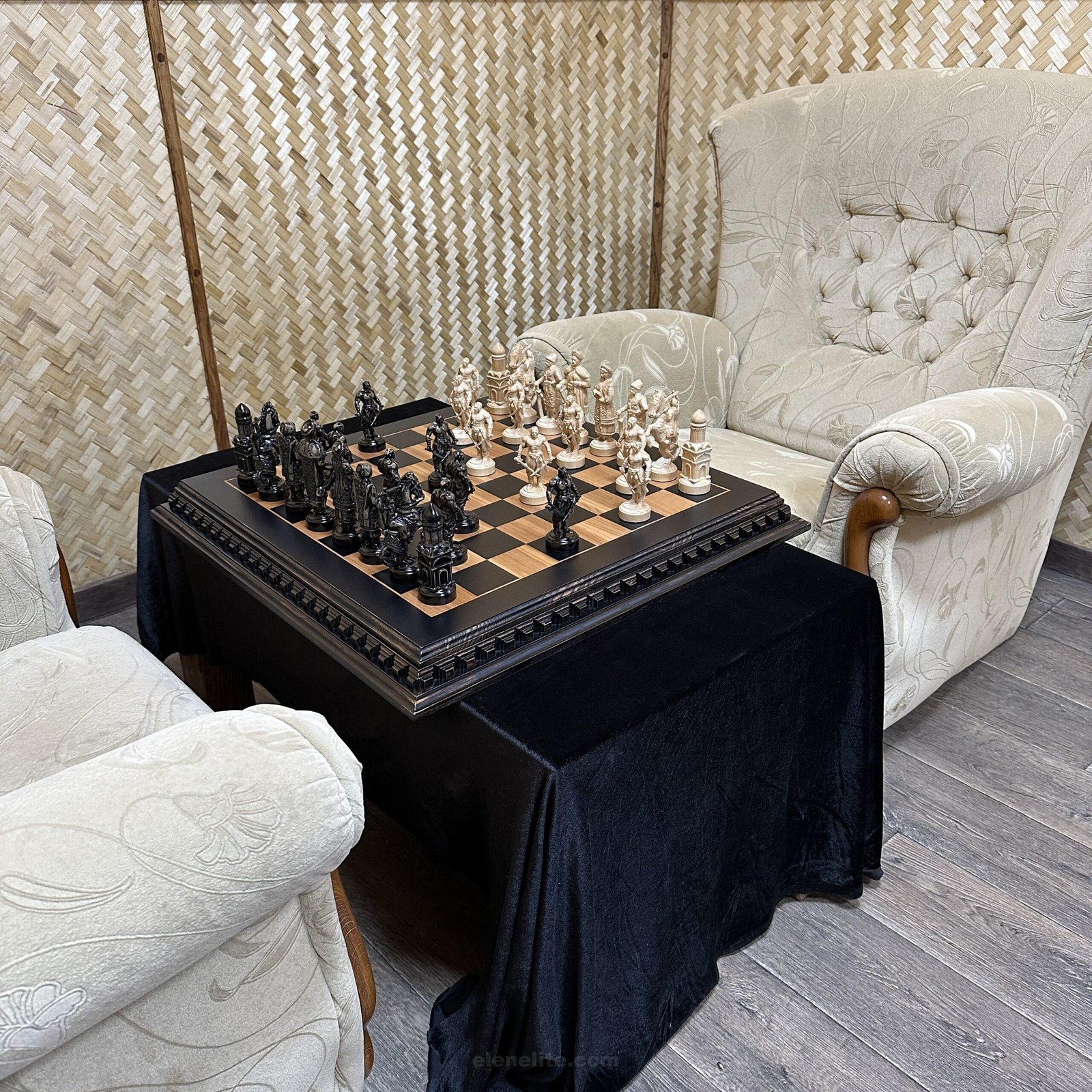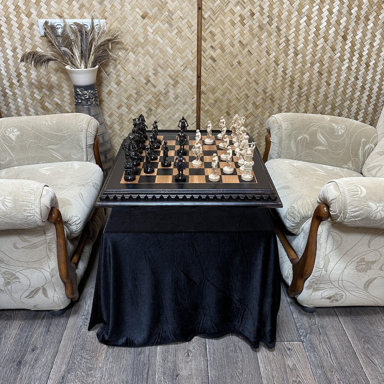 A unique, handcrafted chess set in a classic style featuring “Cossack” pieces. The ash board is finished with a black patina, imparting depth and a refined hue. The handcrafted maple pieces are stylized as Cossack warriors, with expressive details and a distinctive national character.