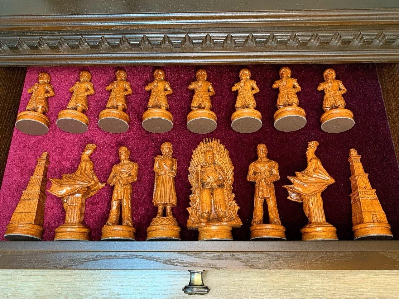 Multifunctional handcrafted chess set made from ash wood with side drawers for convenient storage. Includes 32 unique pieces: 16 Knights and 16 “Battle of Thrones” characters.