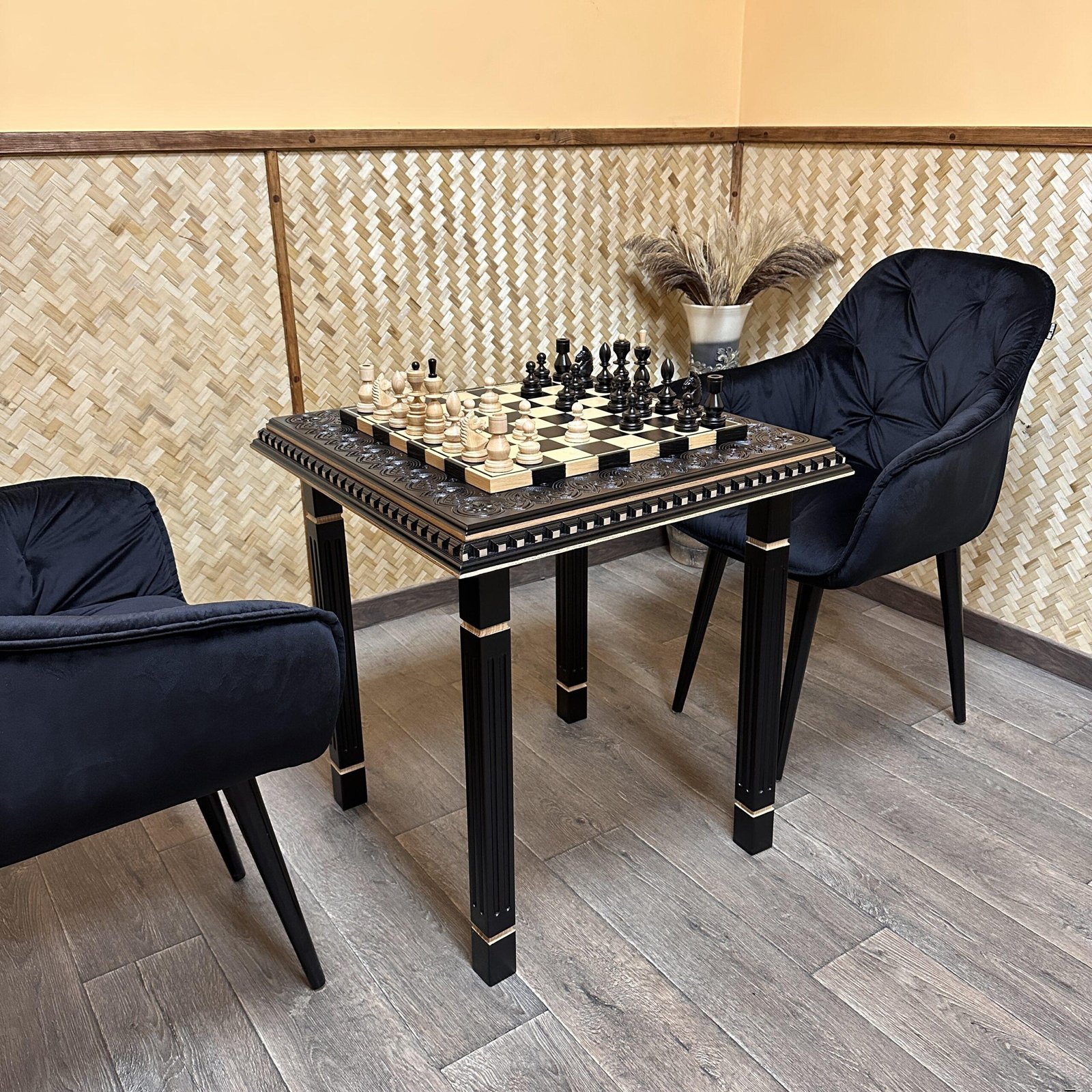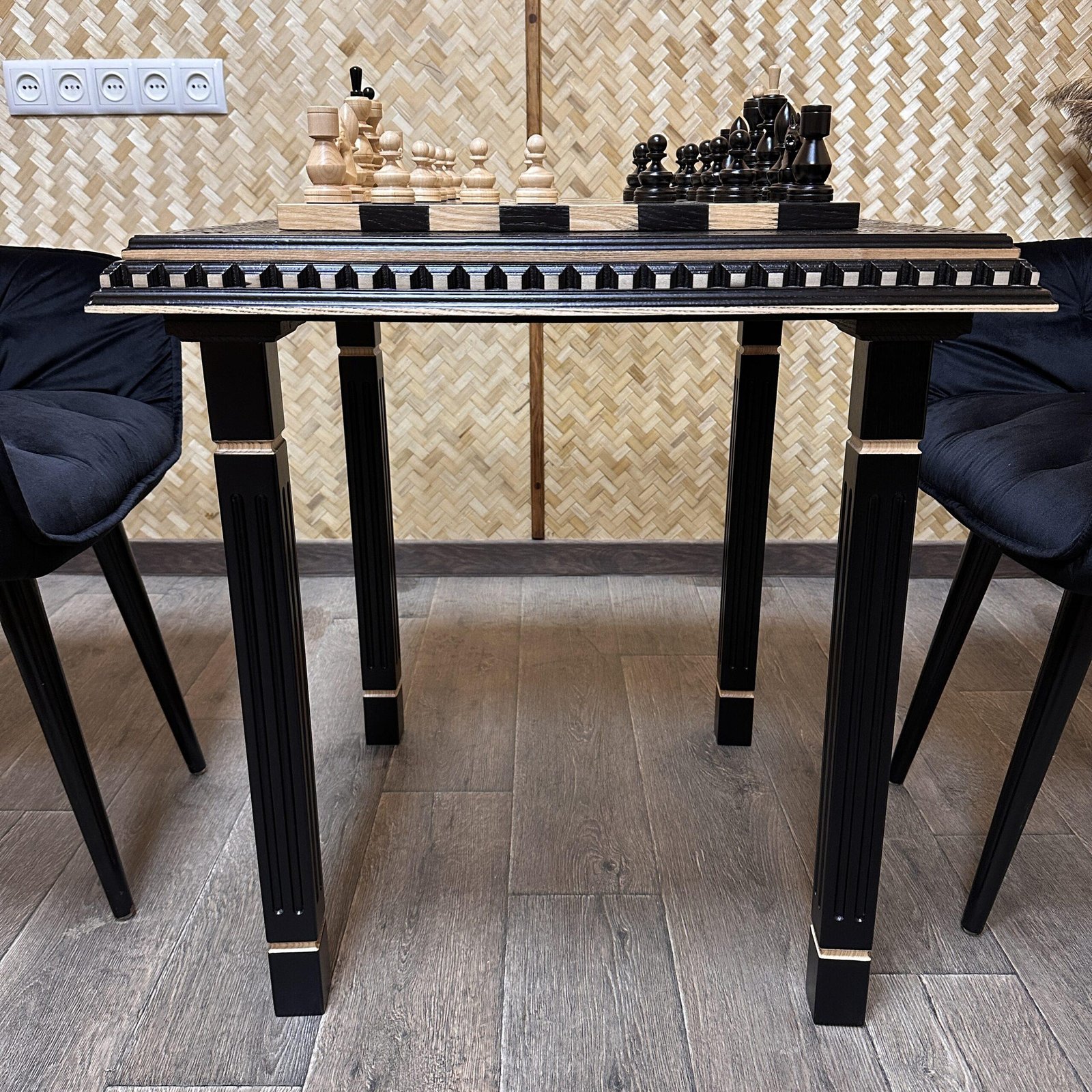 This elegant chess set features a refined table with four carved legs made of natural ash. The black and beige table is decorated with contour carvings. The set includes classic-design chess pieces in the same color scheme. Each piece is handcrafted and harmoniously complements the style of the table.