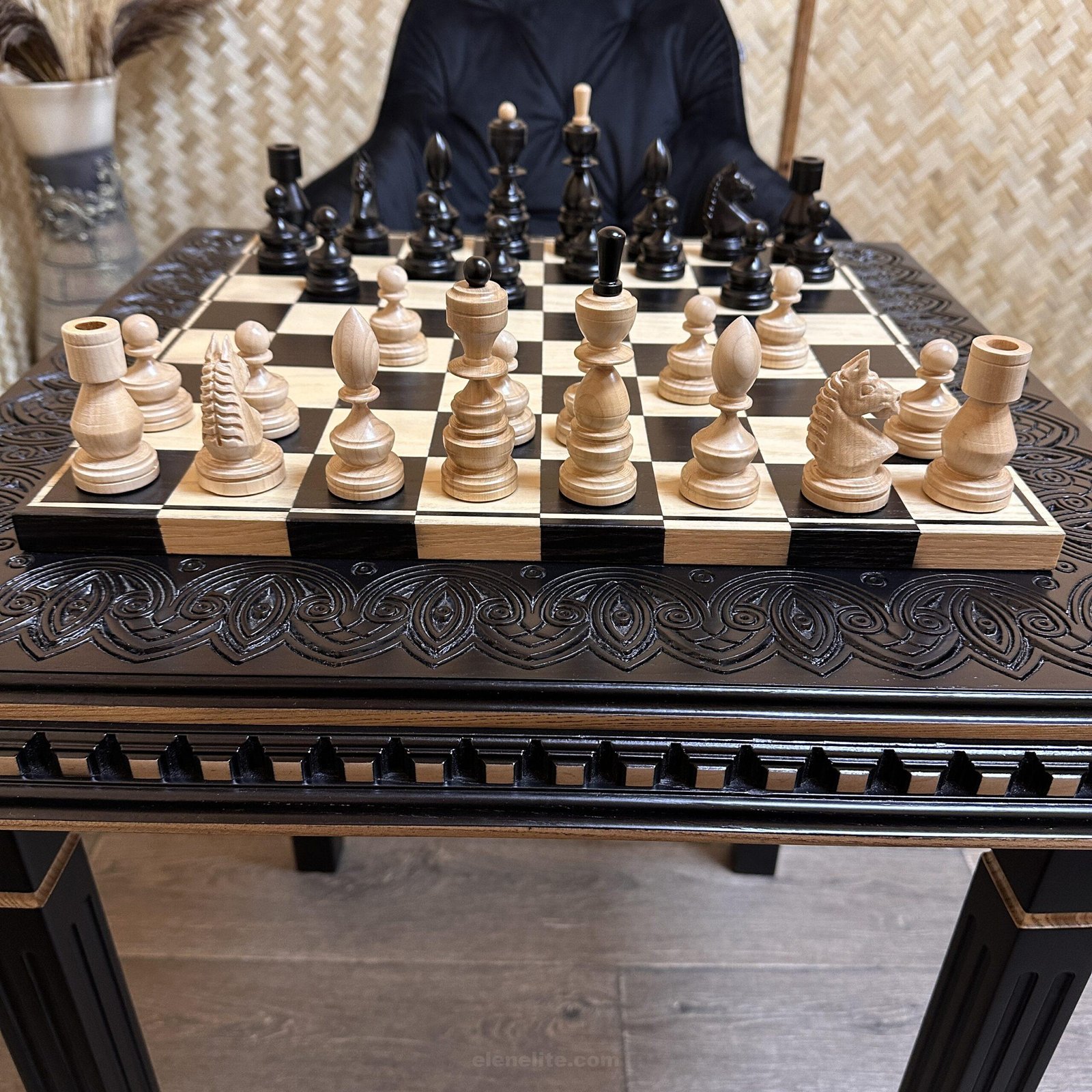 DESIGN: the chess board is decorated with carvings; the chess pieces are made in a classic style; exclusively designed by our “Elen Elite” craftsmen