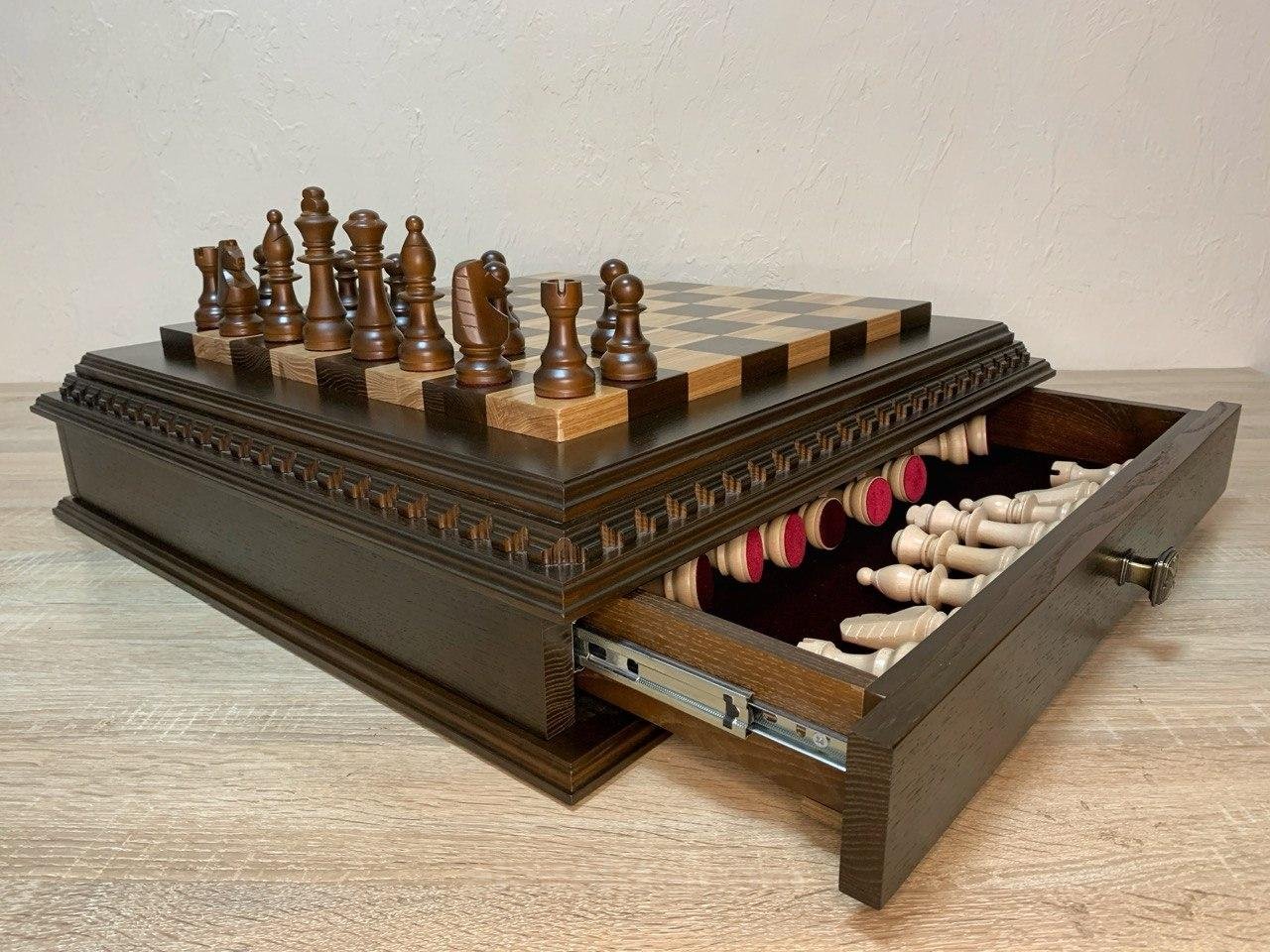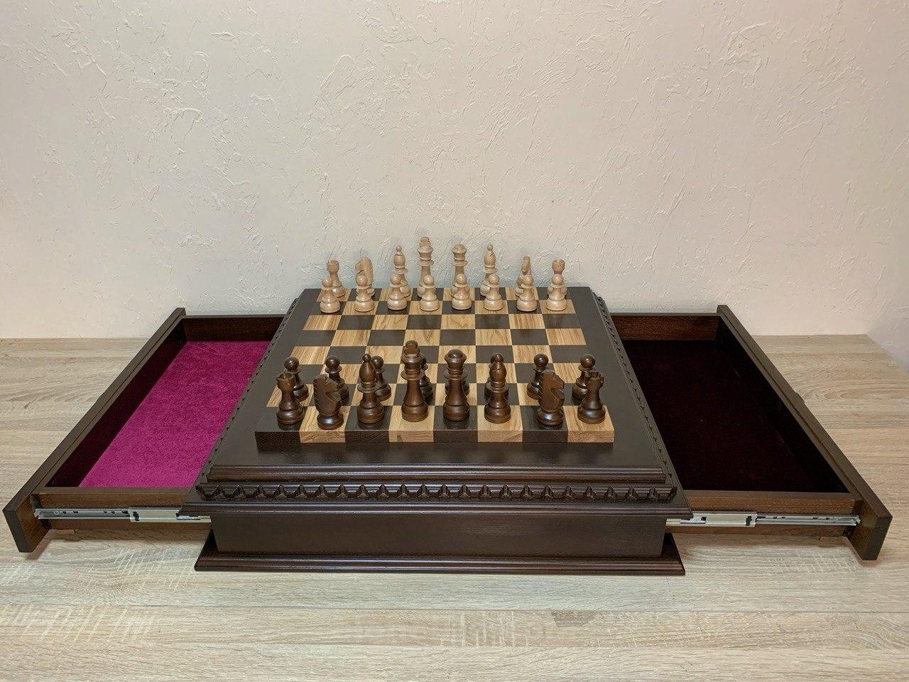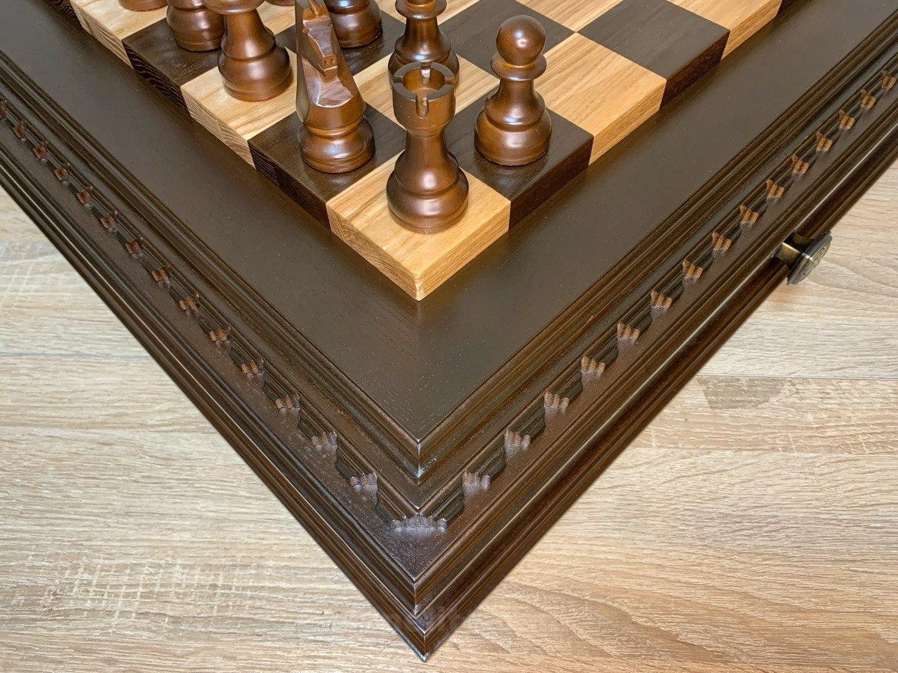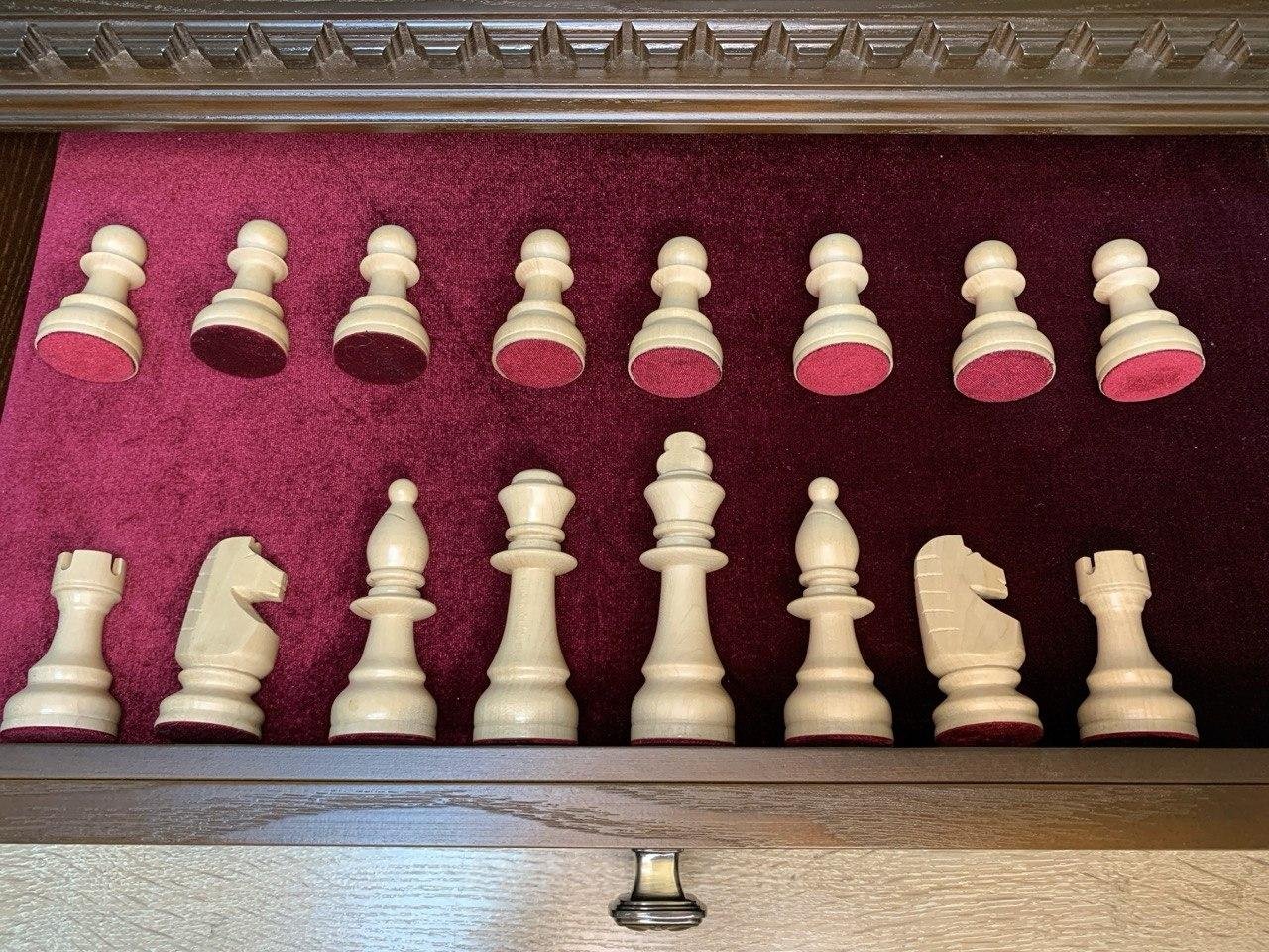 Another distinctive feature of the board is its correct orientation: the dark square is positioned on the left. The drawers are placed on both the right and left sides, so during gameplay they remain easily accessible, allowing players to conveniently place captured pieces directly into them without interrupting the flow of the game.