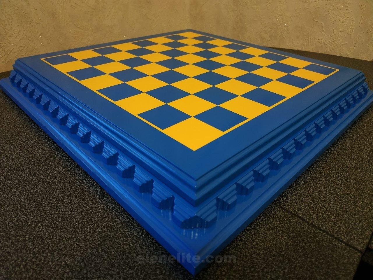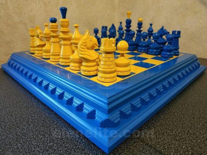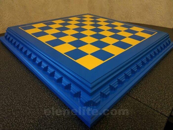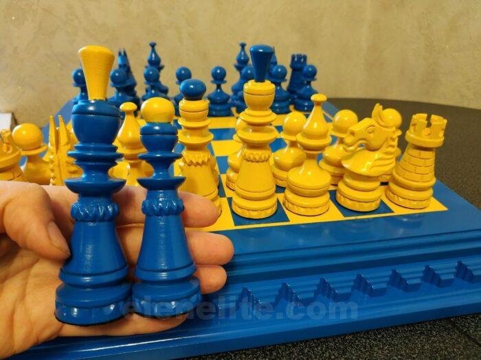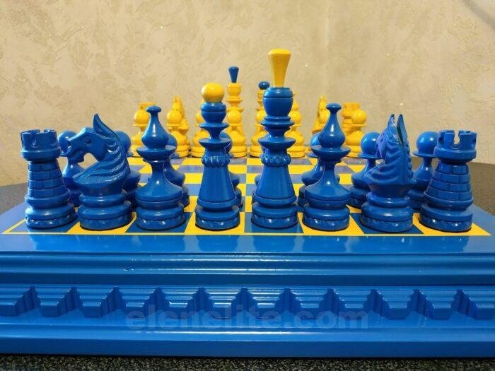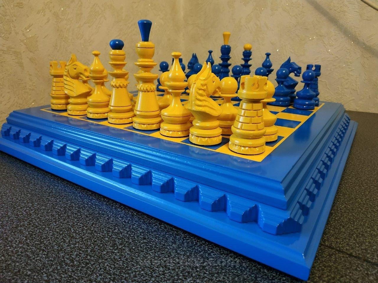 This custom chess set is a shining example of an individual approach to design. The board is made of ash, and the pieces are made of maple, both elements are hand-painted in blue and yellow. Such a bold color combination makes the set not just a gaming accessory, but a stylish accent of the interior.