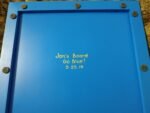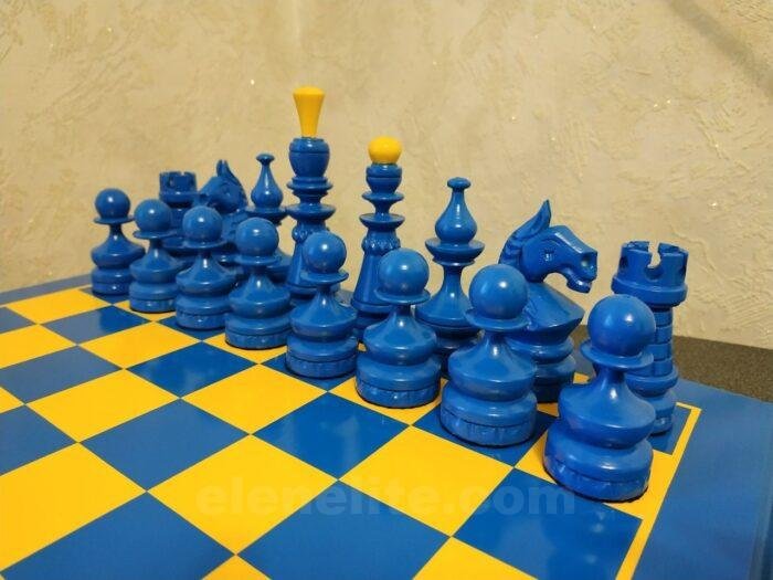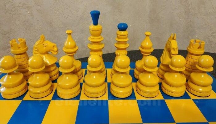 An original chess set in a bright blue and yellow design. The ash board and maple pieces are hand-painted. The non-standard color scheme makes this set special.