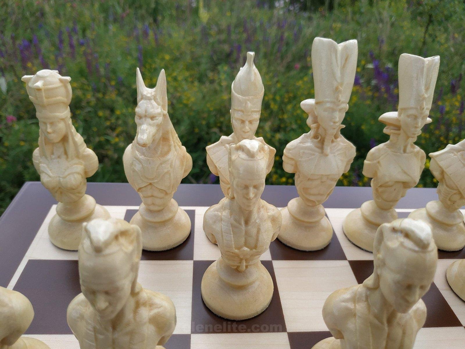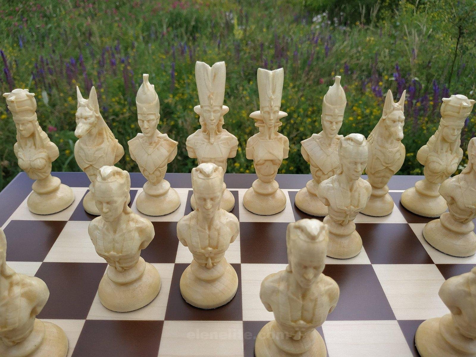 A chess set with a unique design inspired by the culture of Ancient Egypt. The main focus is the original chess pieces, handmade from maple in the form of pharaohs, Gods, Anubis and other symbolic images. Each piece is worked out with high detail, reflecting the characteristic elements of Egyptian aesthetics.