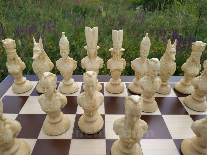 A unique chess set with Egyptian-style figures. Classic ash board and maple figures, handmade in the images of pharaohs. The unusual design makes this set an original accent in any collection or interior.