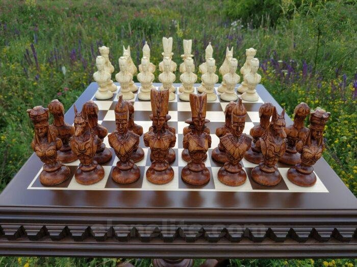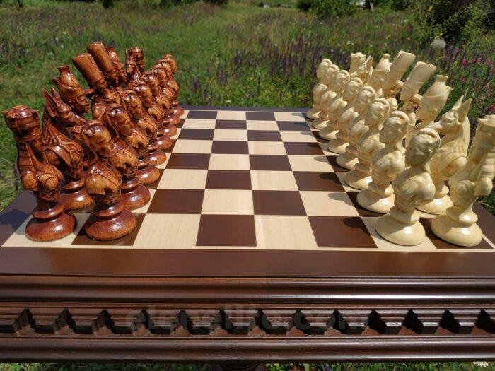 An exclusive handcrafted set: a carved ash table with drawers and 32 detailed pieces — knights and heroes from the cult series "Game of Thrones." A perfect set for connoisseurs of unique items and collectible chess sets.