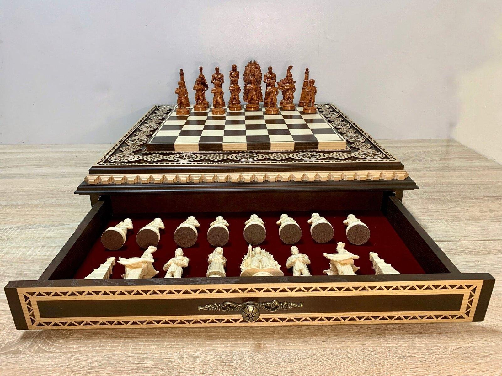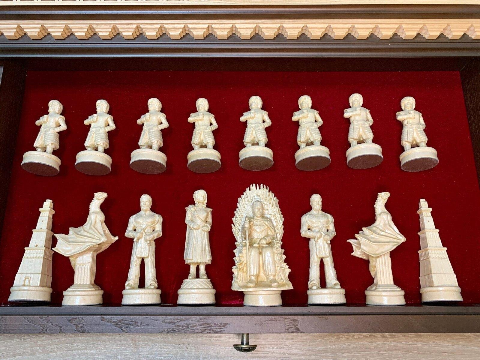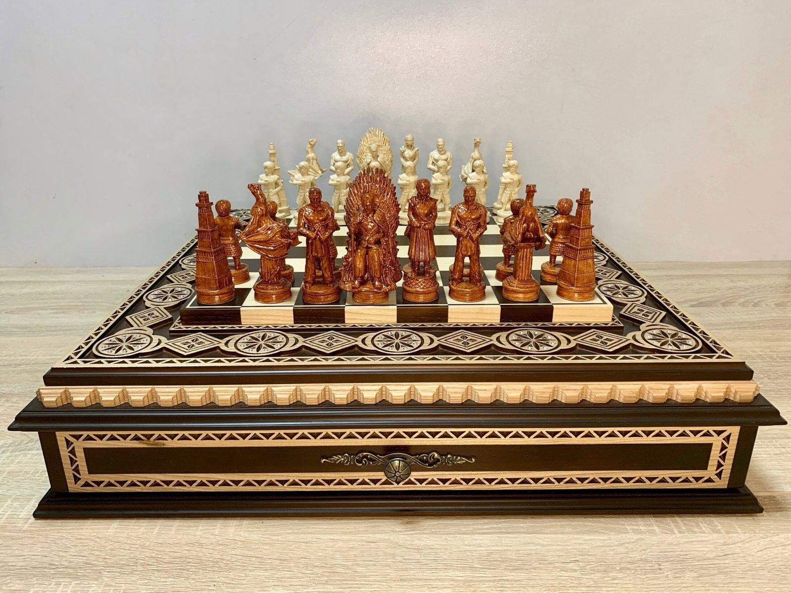 An elegant chess set with a board decorated with light carvings and decorative beads. Two drawers for careful storage of pieces. The set includes 32 unique pieces based on the Game of Thrones with premium detailing.