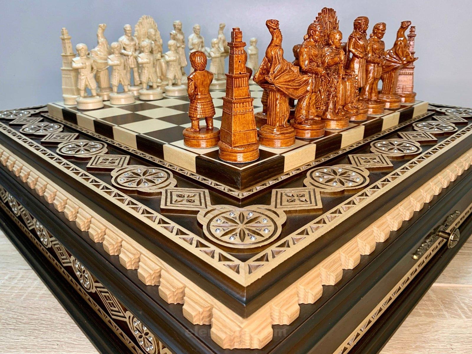 This chess set will be the centerpiece of any collection. The handcrafted natural wood board is made in brown tones and decorated with delicate light carvings and inlaid with decorative beads. Two pull-out drawers with a soft velvet lining allow you to neatly store the pieces, protecting them from damage. The set includes 32 unique maple chess pieces inspired by the Game of Thrones universe: Jon Snow, Daenerys, Dragon, Drogo and Tyrion. Each piece is crafted with premium detailing – from facial features to costume elements, making this set not only a gaming accessory, but also a true work of art.