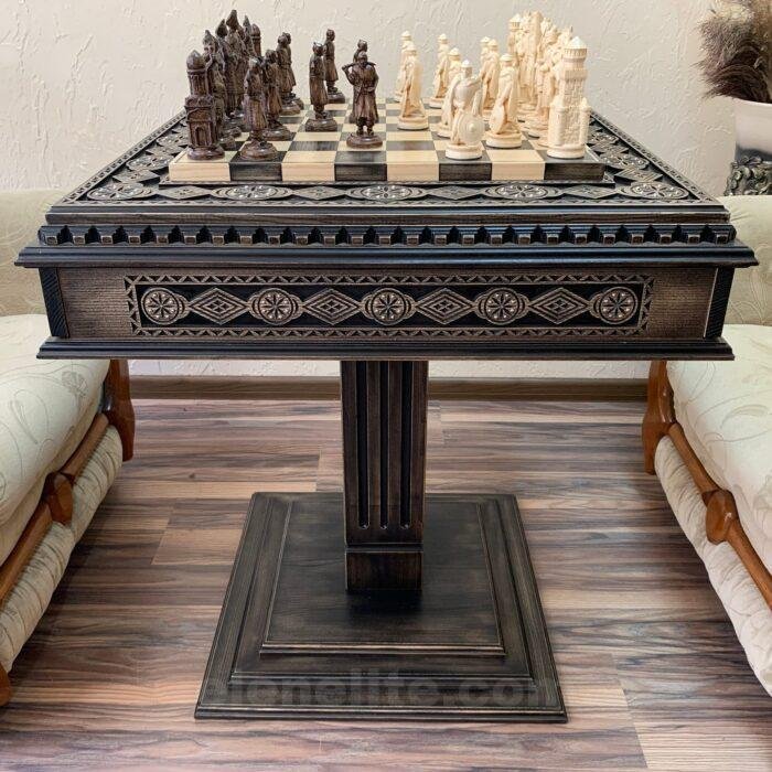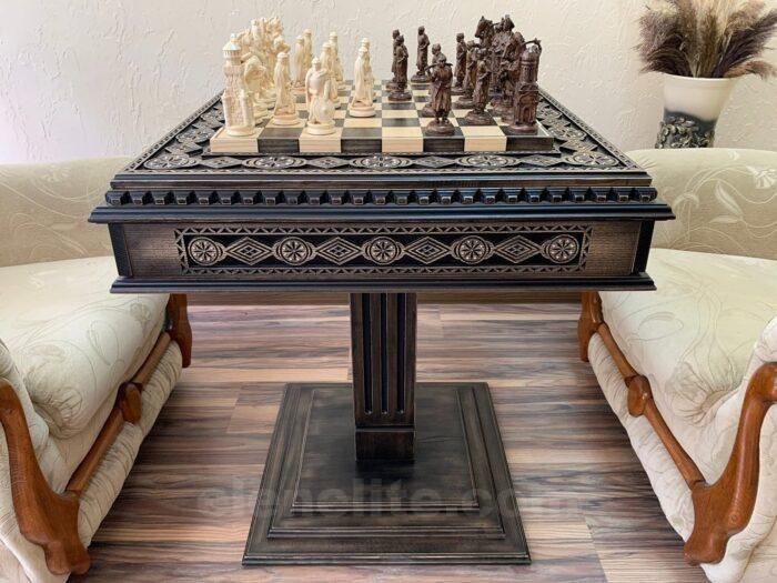 A handcrafted single-leg ash table in a black patina finish with carvings and beads, and two velvet-lined drawers for storing chess pieces. The set includes 16 pieces of Ukrainian Cossacks with their ataman and 16 medieval knights with detailed armor and weapons. A unique set for history and chess lovers.