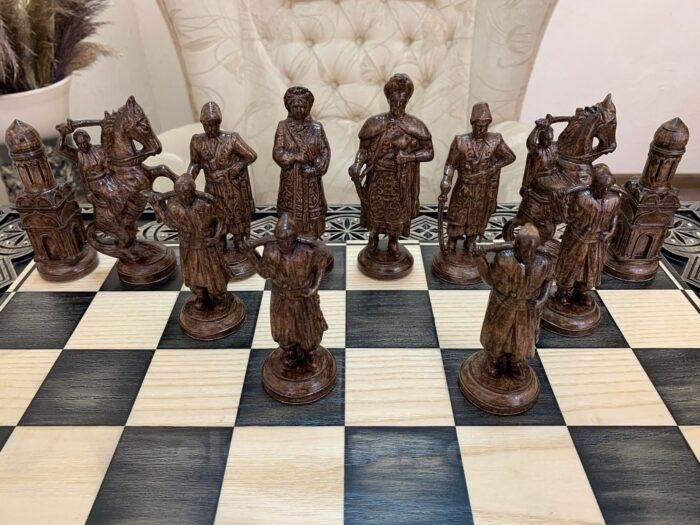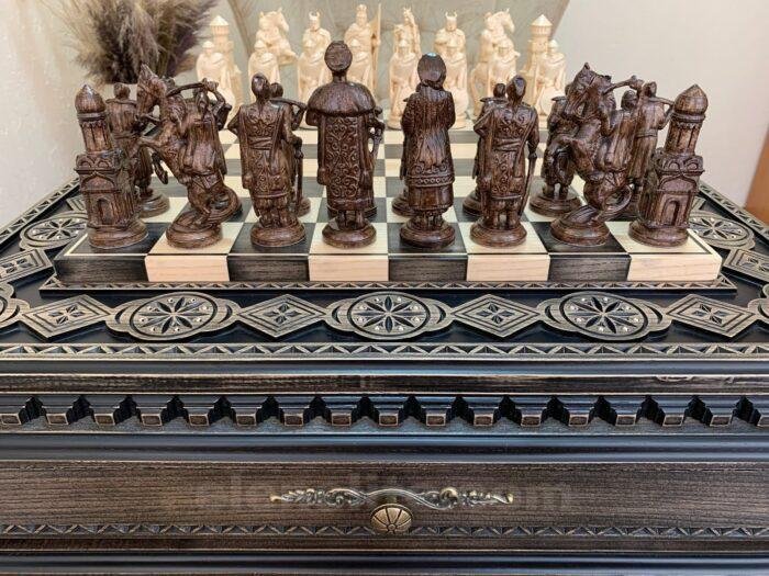 DESIGN: the chess board is decorated with carvings and beads; 16 chess pieces – Ukrainian Cossacks and 16 pieces – Knights; exclusively designed by our “Elen Elite” craftsmen