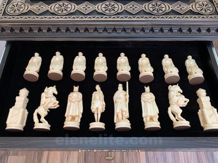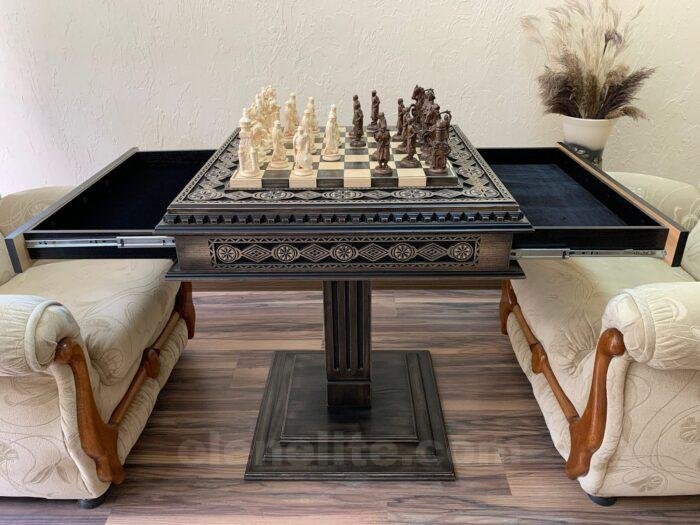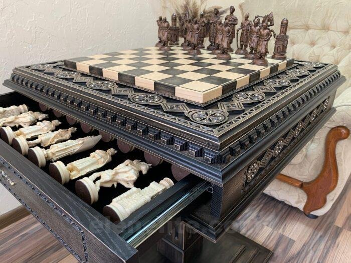 Chess Set: Chess Table “Bright Victory” with 2 Drawers + chess pieces “Cossacks” & “Knights”