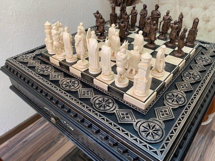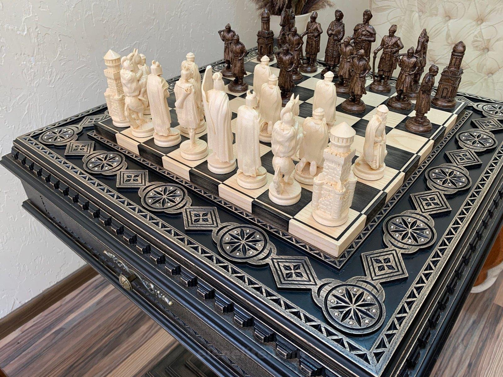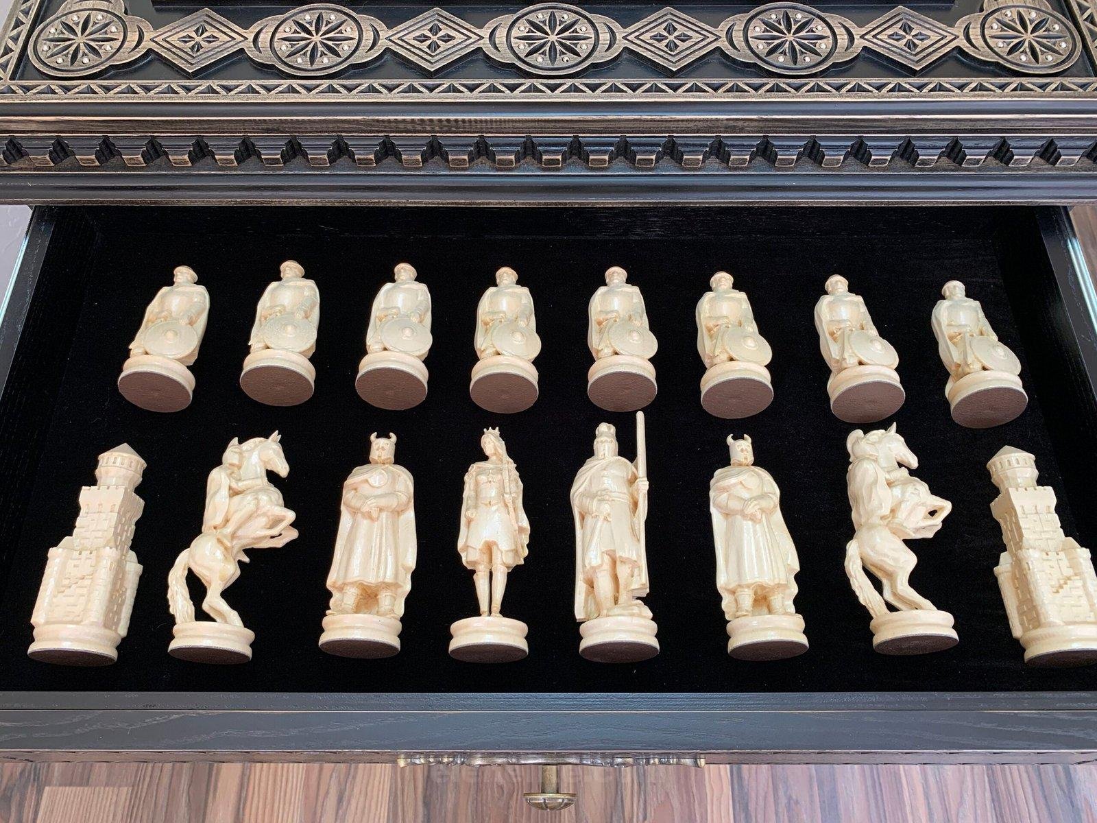 This unique chess set combines handcrafted craftsmanship with historical themes. The ash table stands on a single, sturdy leg, is painted black, and is adorned with exquisite carvings and decorative beads. Two pull-out drawers with a soft velvet lining ensure the chess pieces are carefully stored. The chess pieces create a truly historical atmosphere: 16 of them depict Ukrainian Cossacks with their ataman, and another 16 depict medieval knights with meticulously crafted armor, weapons, and clothing. Each piece is crafted with exquisite detail, making the game a visual and intellectual delight.