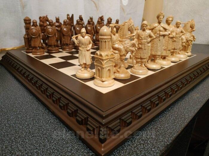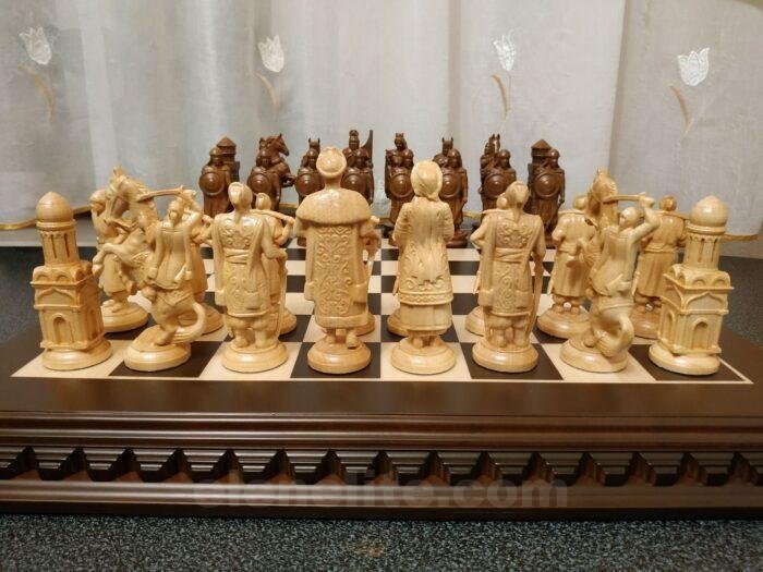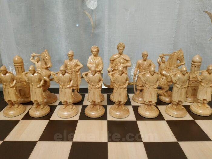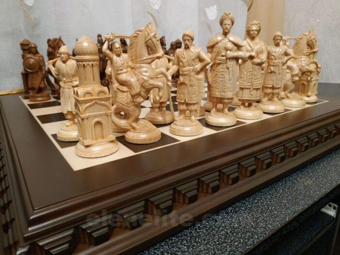 Handmade chess set consists of: classic ash board in dark brown color with contrasting light carving along the edge. The set includes 32 chess pieces: 16 – Ukrainian Cossacks with the ataman as the king, 16 – in the style of medieval knights. Premium detailing – weapons, shields, clothing elements.