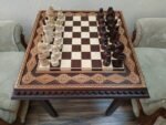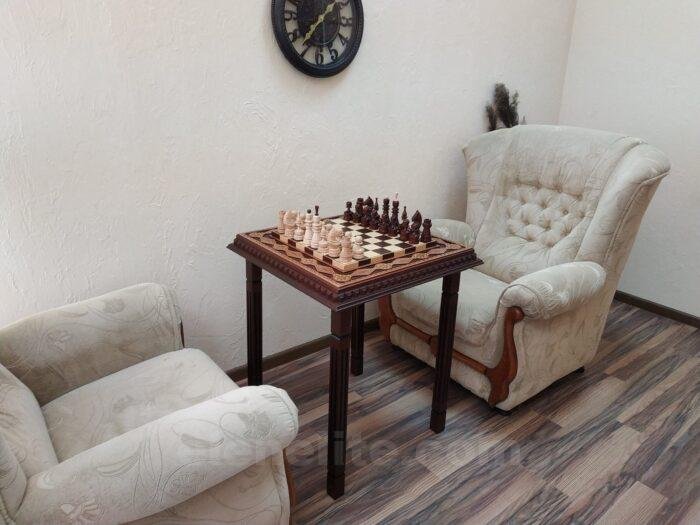 A classic four-legged premium ash table with a carved board and beaded inlay. The set includes classic-style chess pieces — an ideal choice for those who appreciate tradition and elegant style.
