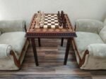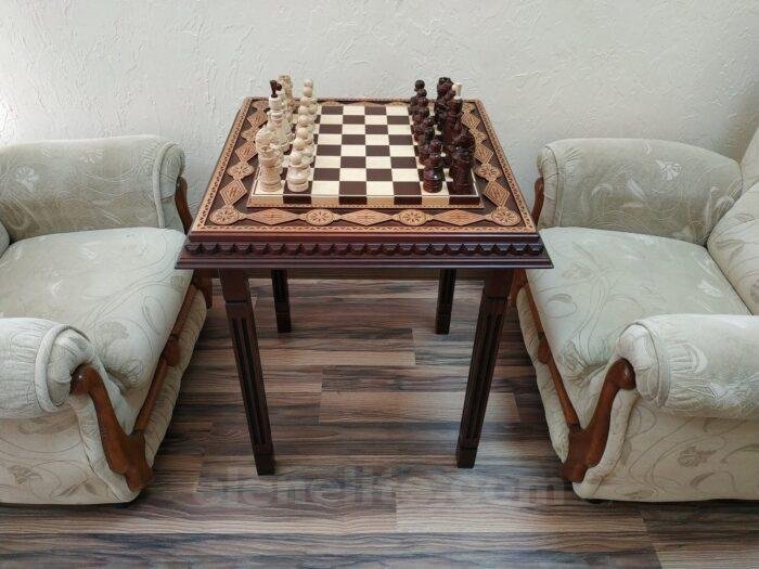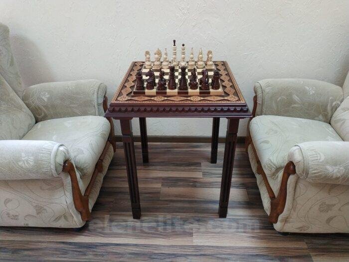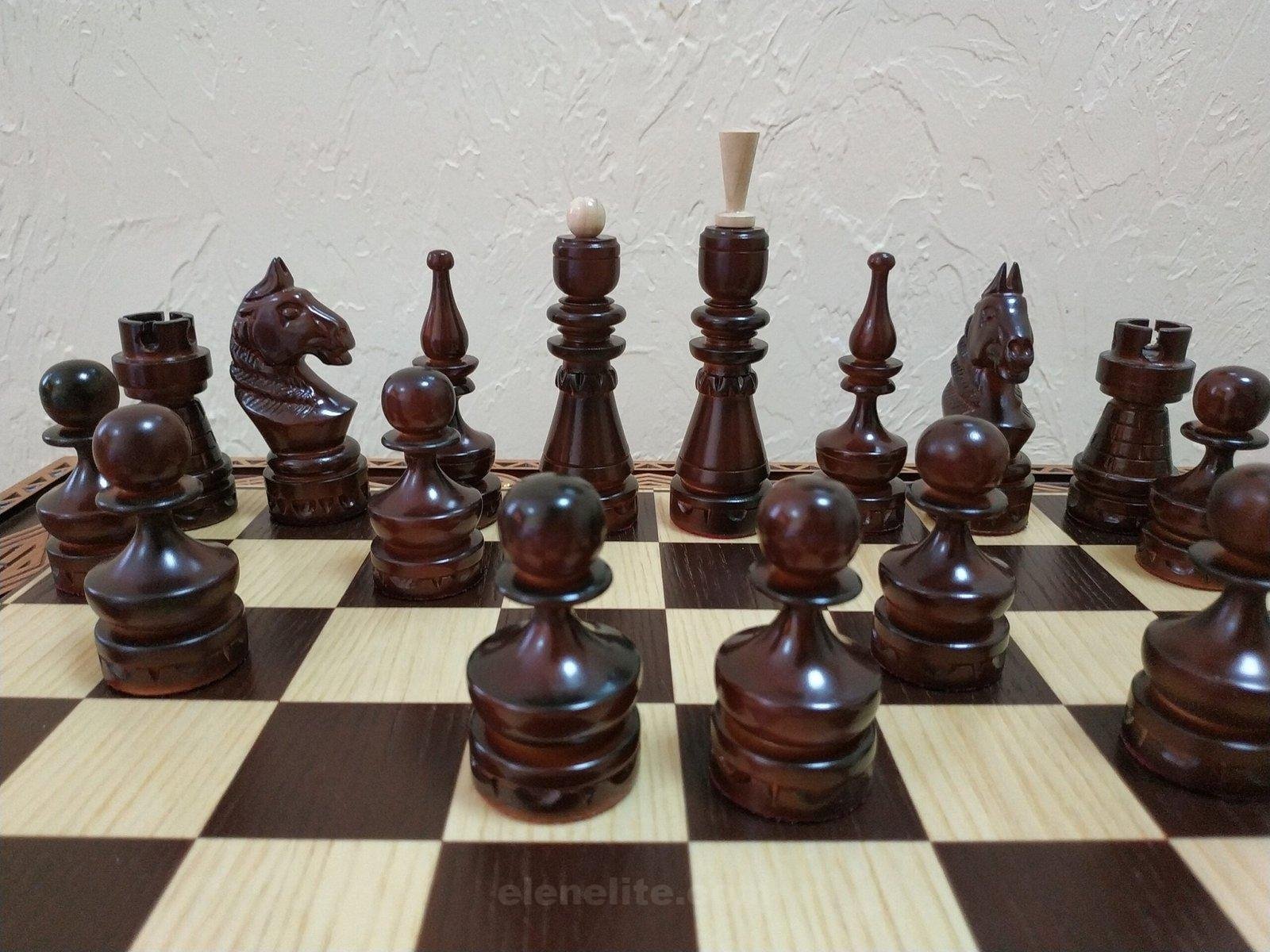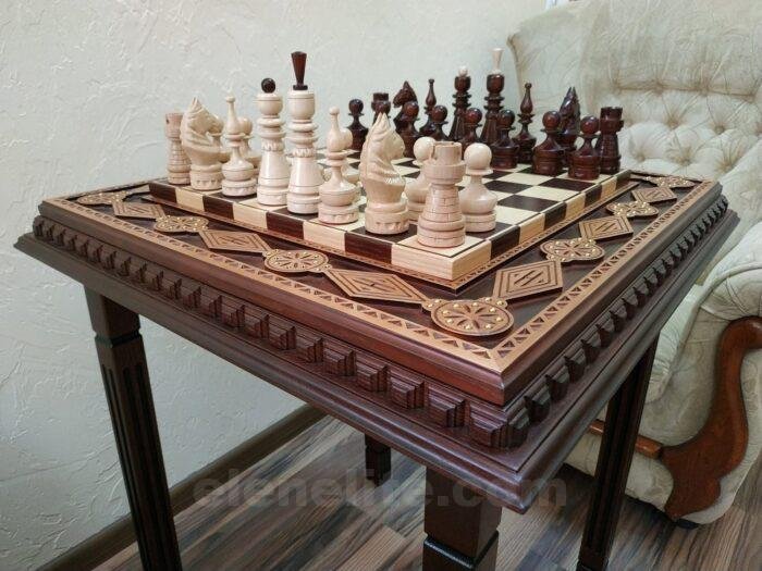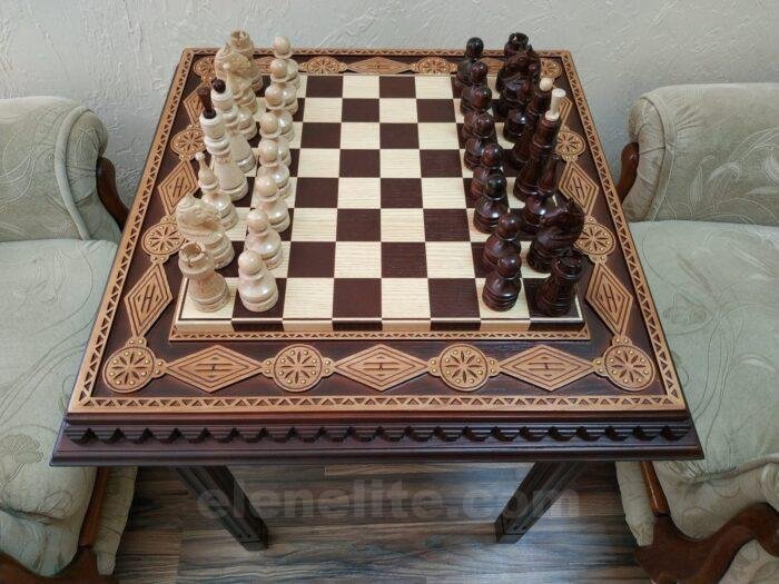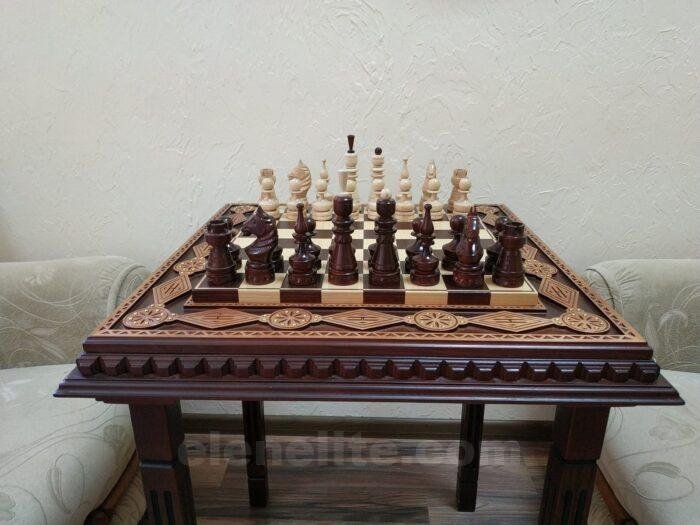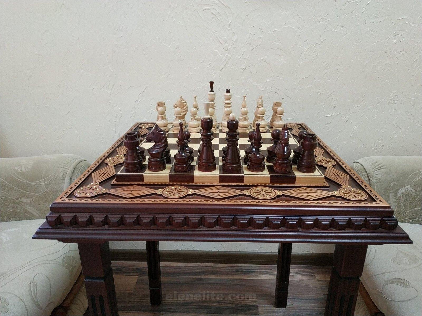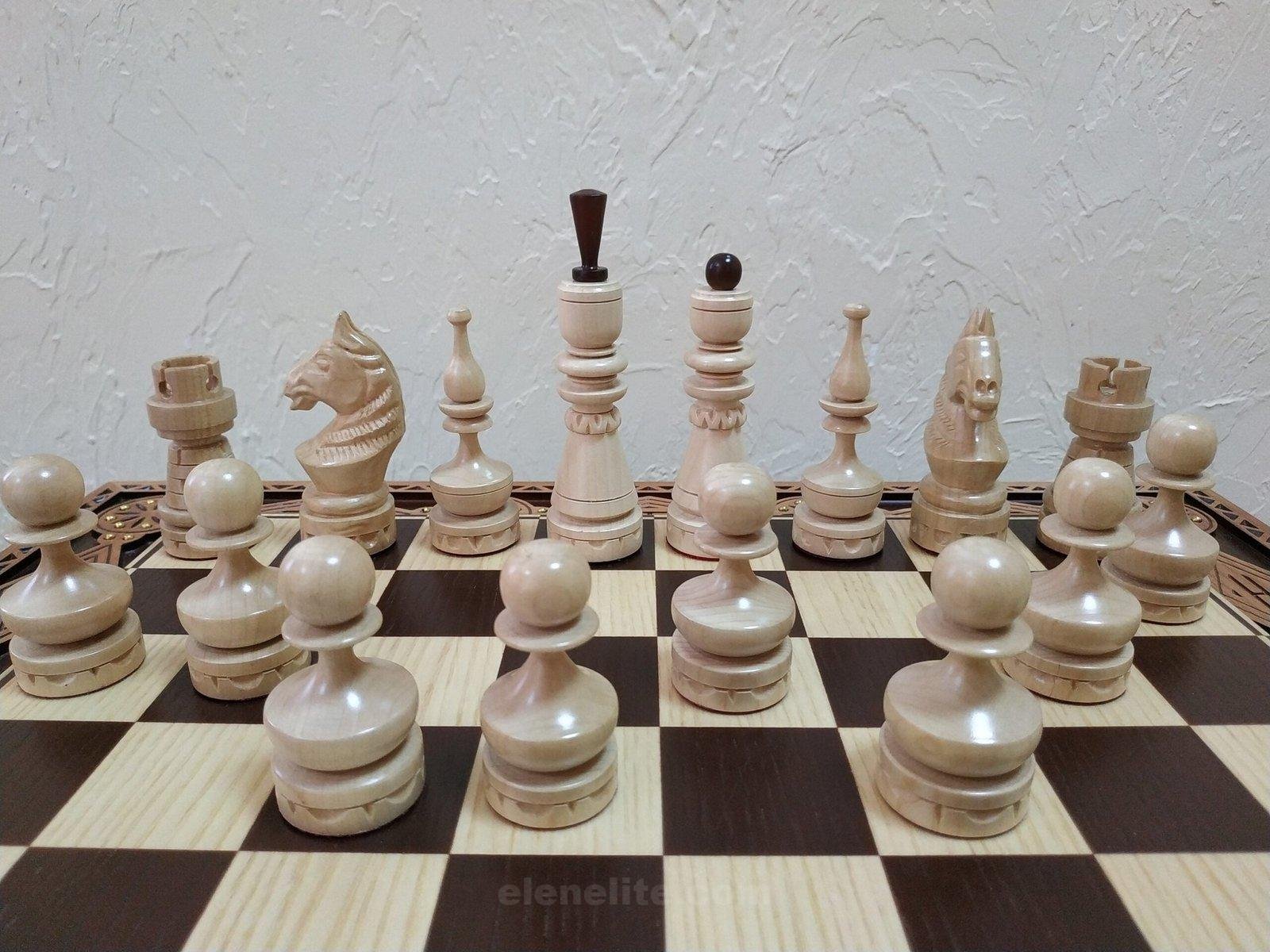DESIGN: the chess board is decorated with carvings and beads; the chess pieces are made in a classic style; exclusively designed by our “Elen Elite” craftsmen