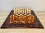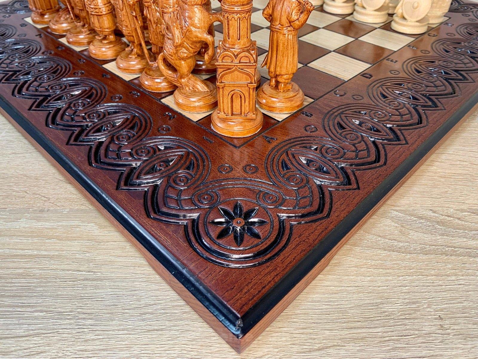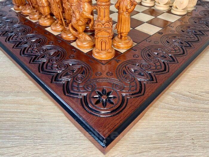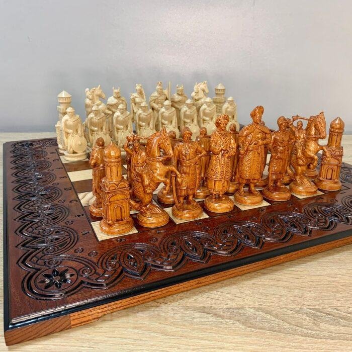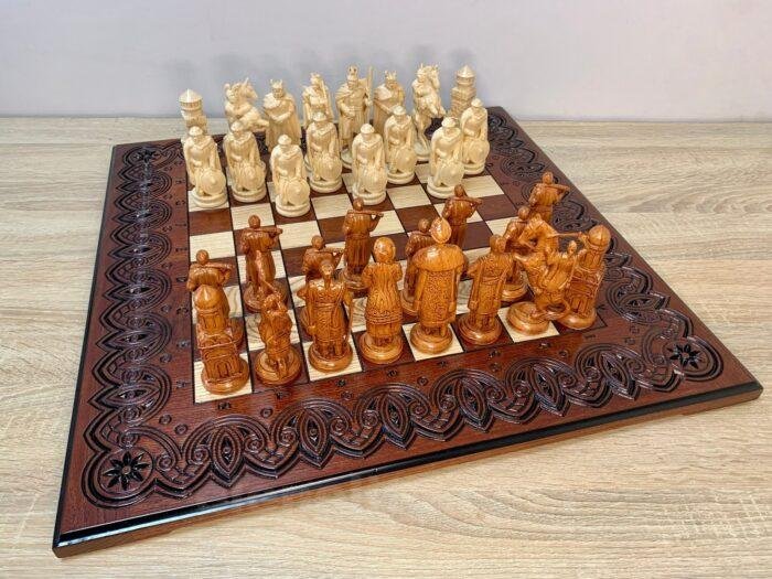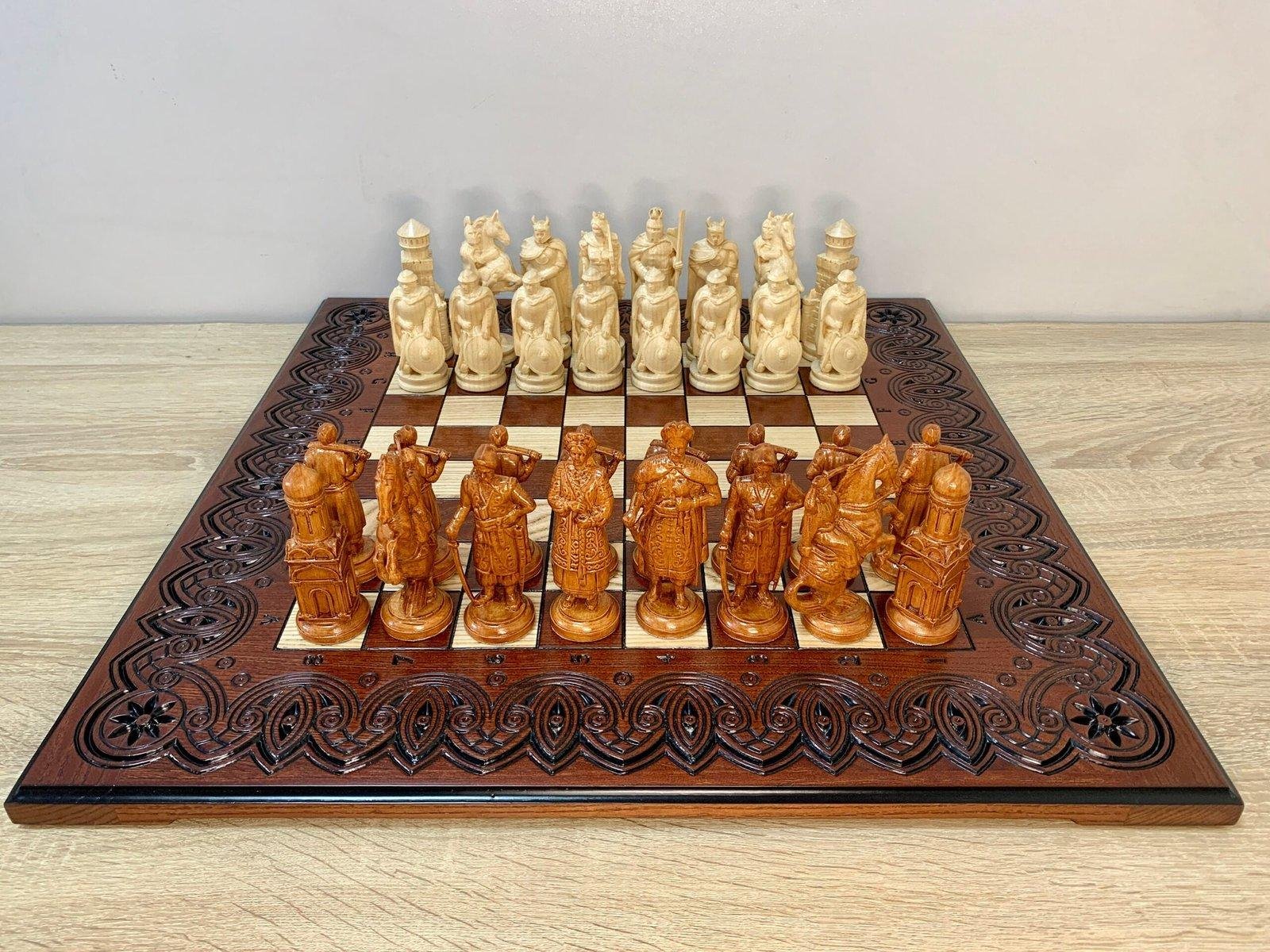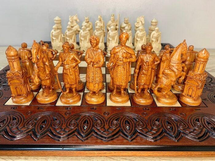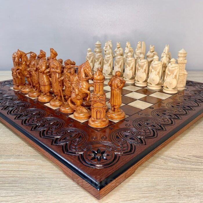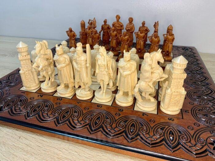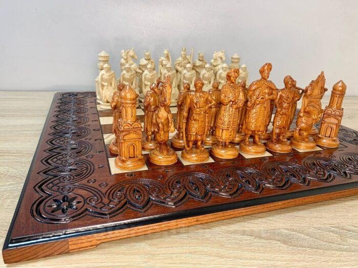 Unique chess set: carved ash board and 32 chess pieces – Ukrainian Cossacks against medieval knights. Premium quality and detail, expressive details, weapons, shields and armor