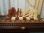 This chess set is designed for those who value both aesthetics and convenience. The chess board is made of durable ash and has an internal drawer with a soft velvet compartment for storing chess pieces. The structure opens and is installed on a stable stand, providing comfort during the game and careful storage. The outer part of the board is decorated with elegant carving and decorative beads.