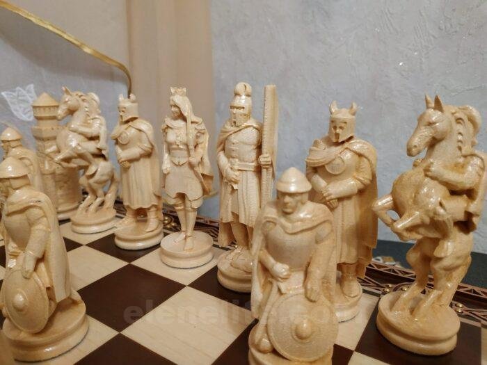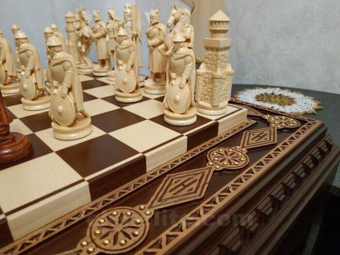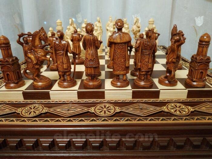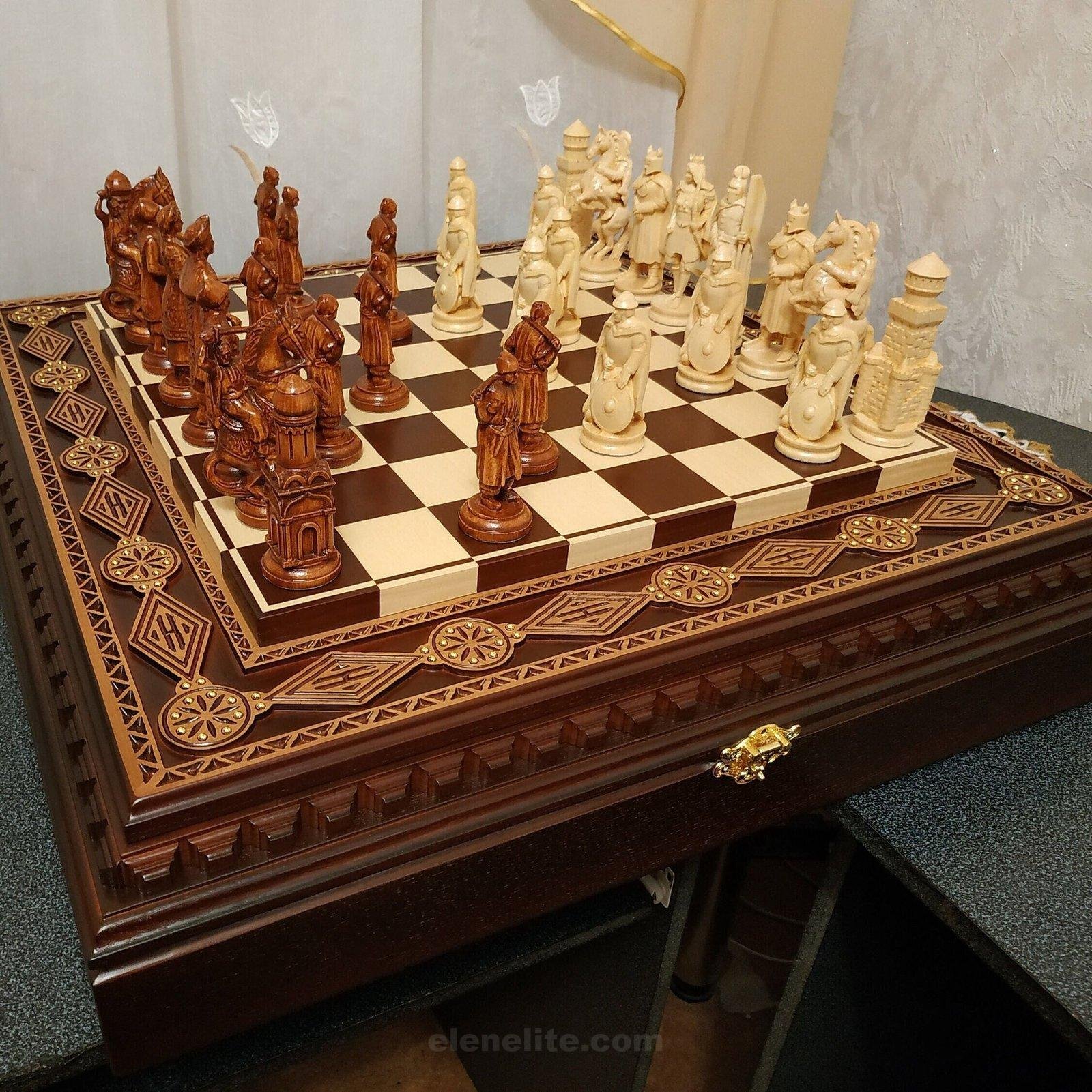 DESIGN: the chess board is equipped with an internal drawer for storing chess pieces and is inlaid with beads; 16 chess pieces – Knights and 16 pieces – Ukrainian Cossacks; exclusively designed by our “Elen Elite” craftsmen.