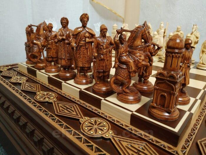 But the main advantage of the set is the pieces: 16 chess pieces of knights and 16 pieces of Ukrainian Cossacks. Each detail is hand-carved, which makes the set not just a game, but a real work of art with a historical character.