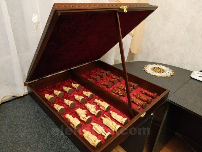 A luxurious chess set: a carved ash board with velvet storage and unique pieces – knights against Ukrainian Cossacks.