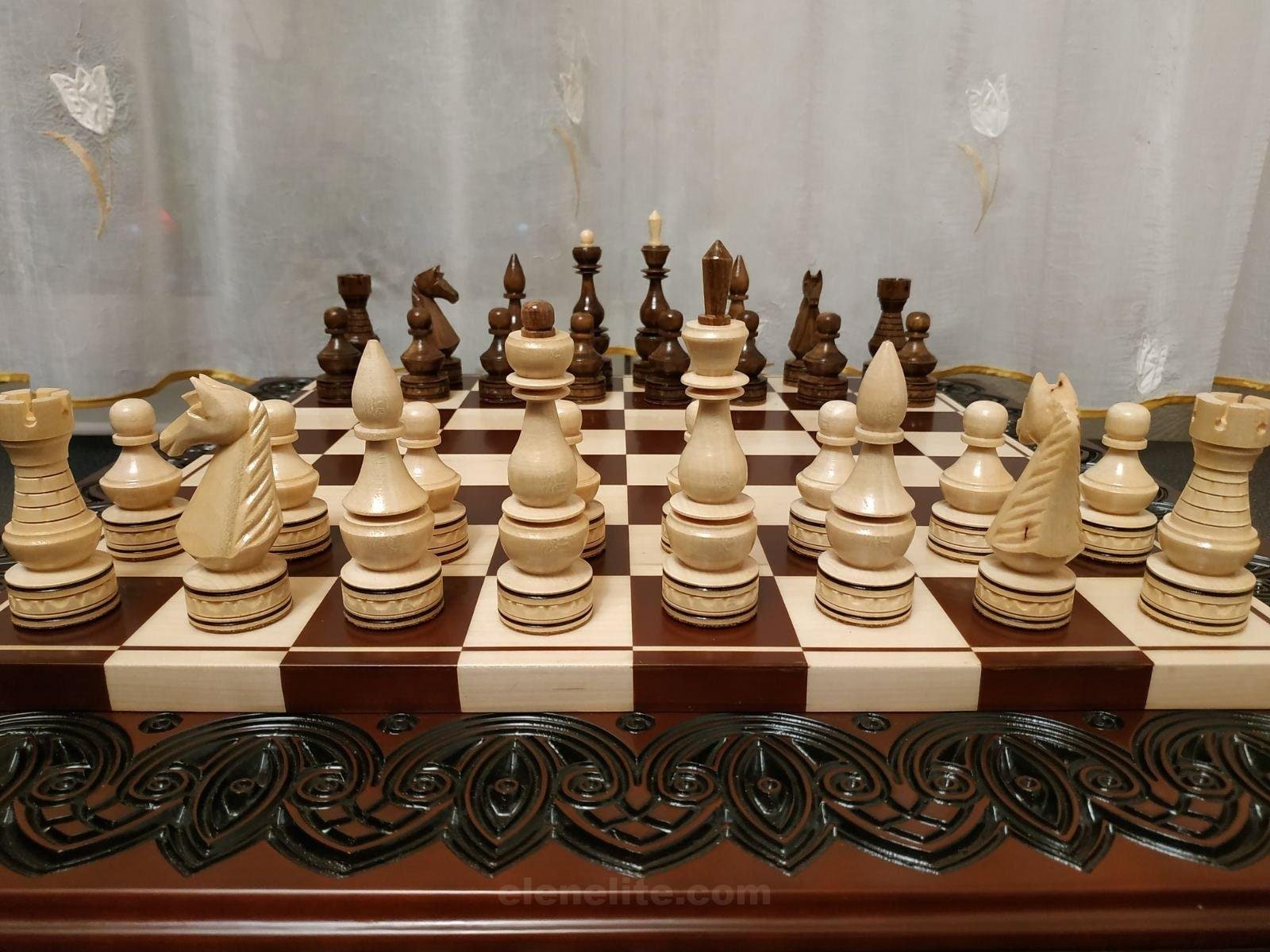 DESIGN: the chess board is decorated with carvings; the chess pieces are made in classic design; exclusively designed by our “Elen Elite” craftsmen.