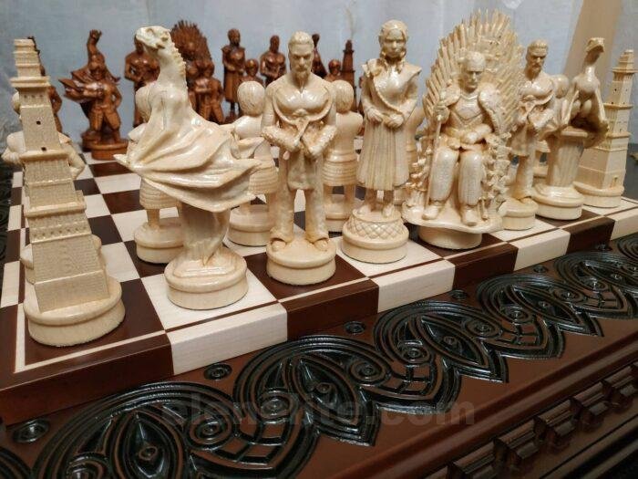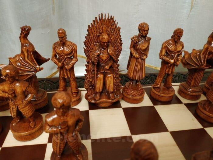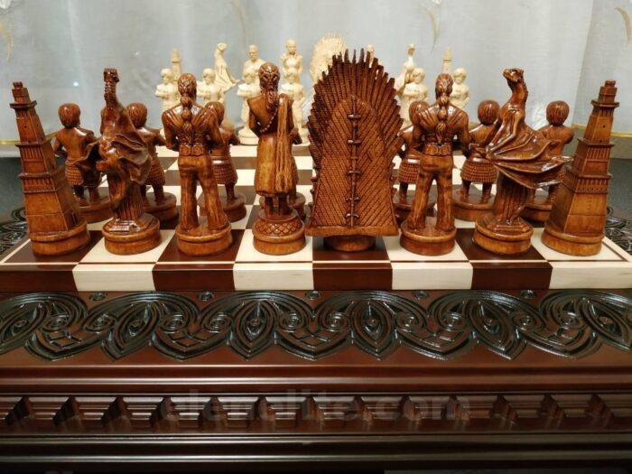 An exclusive chess set: a carved board made of solid ash in a dark brown color and maple pieces made in the images of the characters from the cult series “Game of Thrones”.