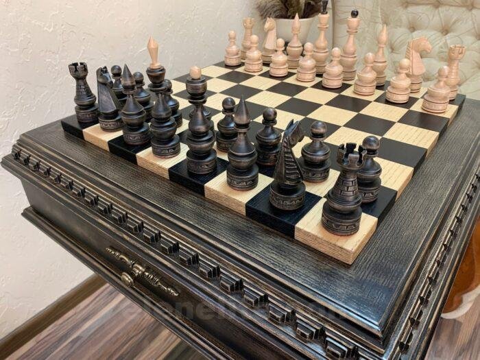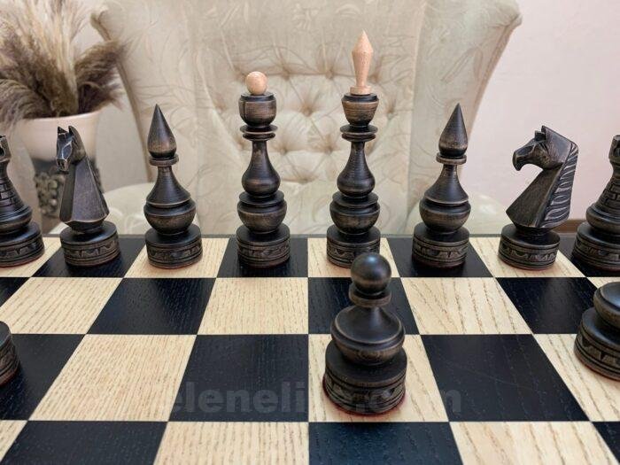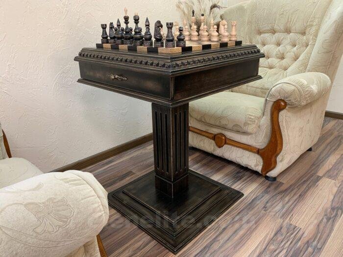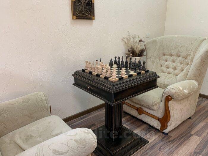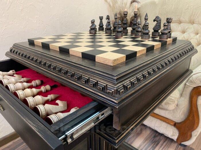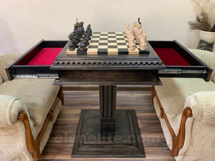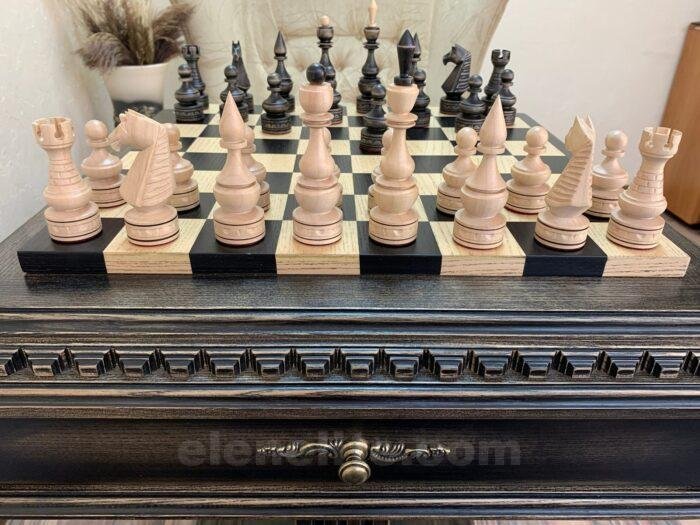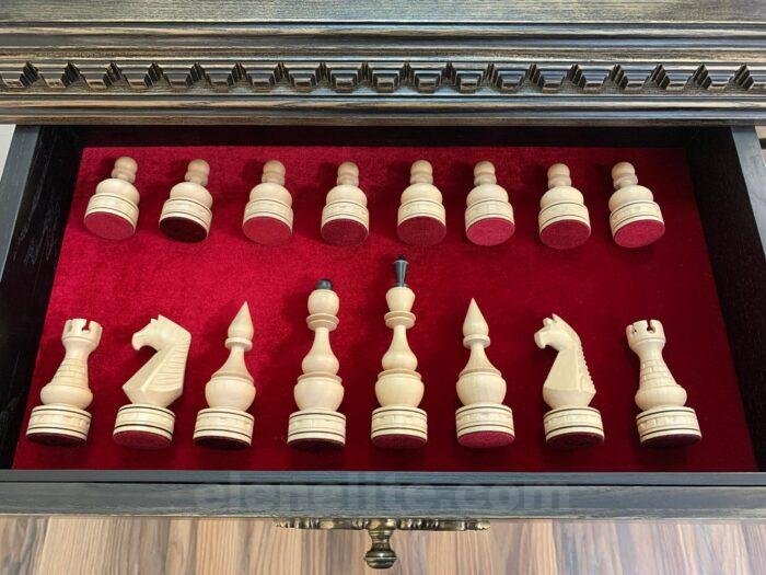 DESIGN: the board is equipped with 2 drawers for storing chess pieces, the chess pieces are made in a classic style; exclusively designed by our “Elen Elite” craftsmen
