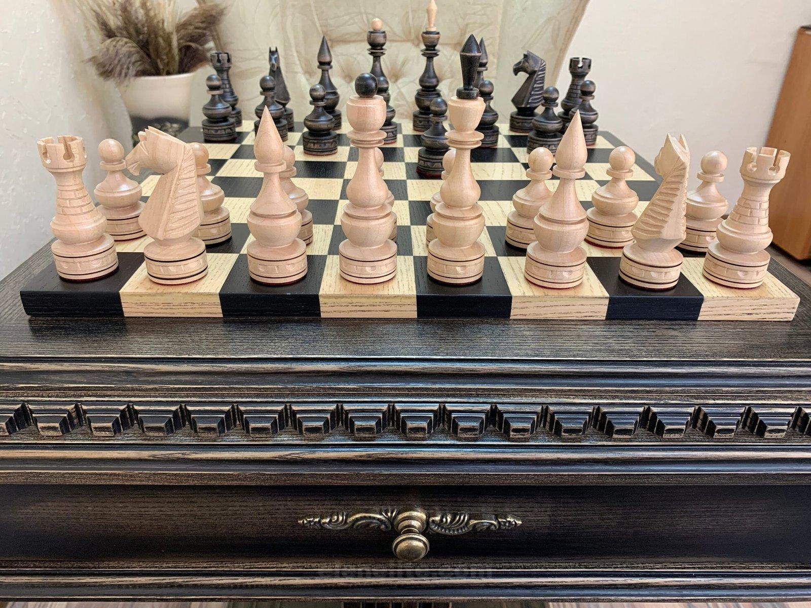 The Black Stone chess set is a premium ash table with exquisite carvings and patina, velvet-lined drawers for careful storage of pieces, and classic maple chess pieces.