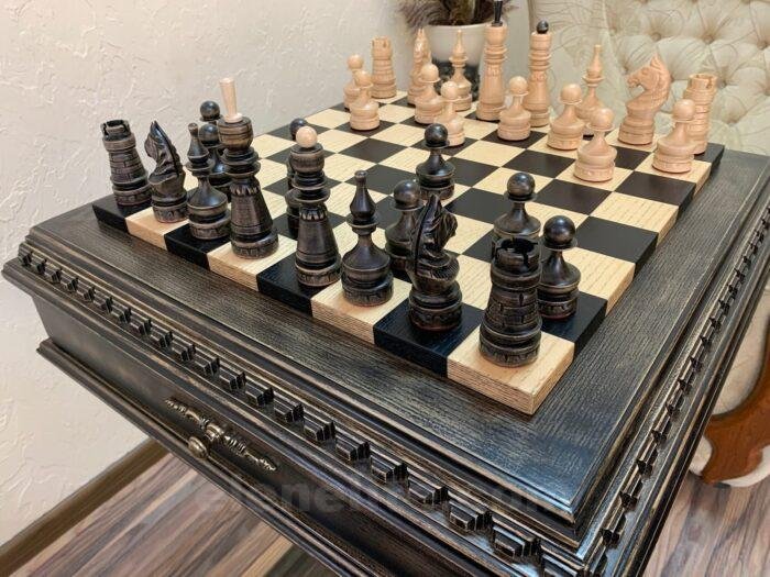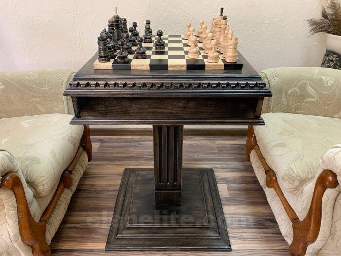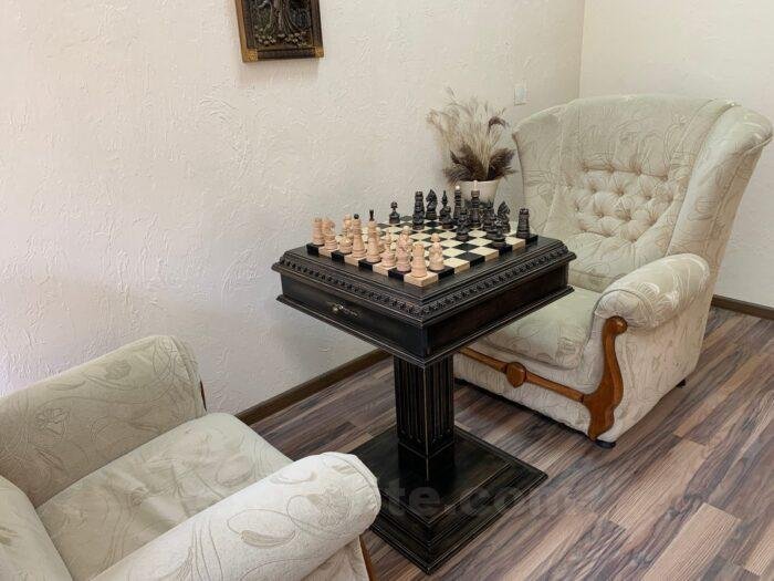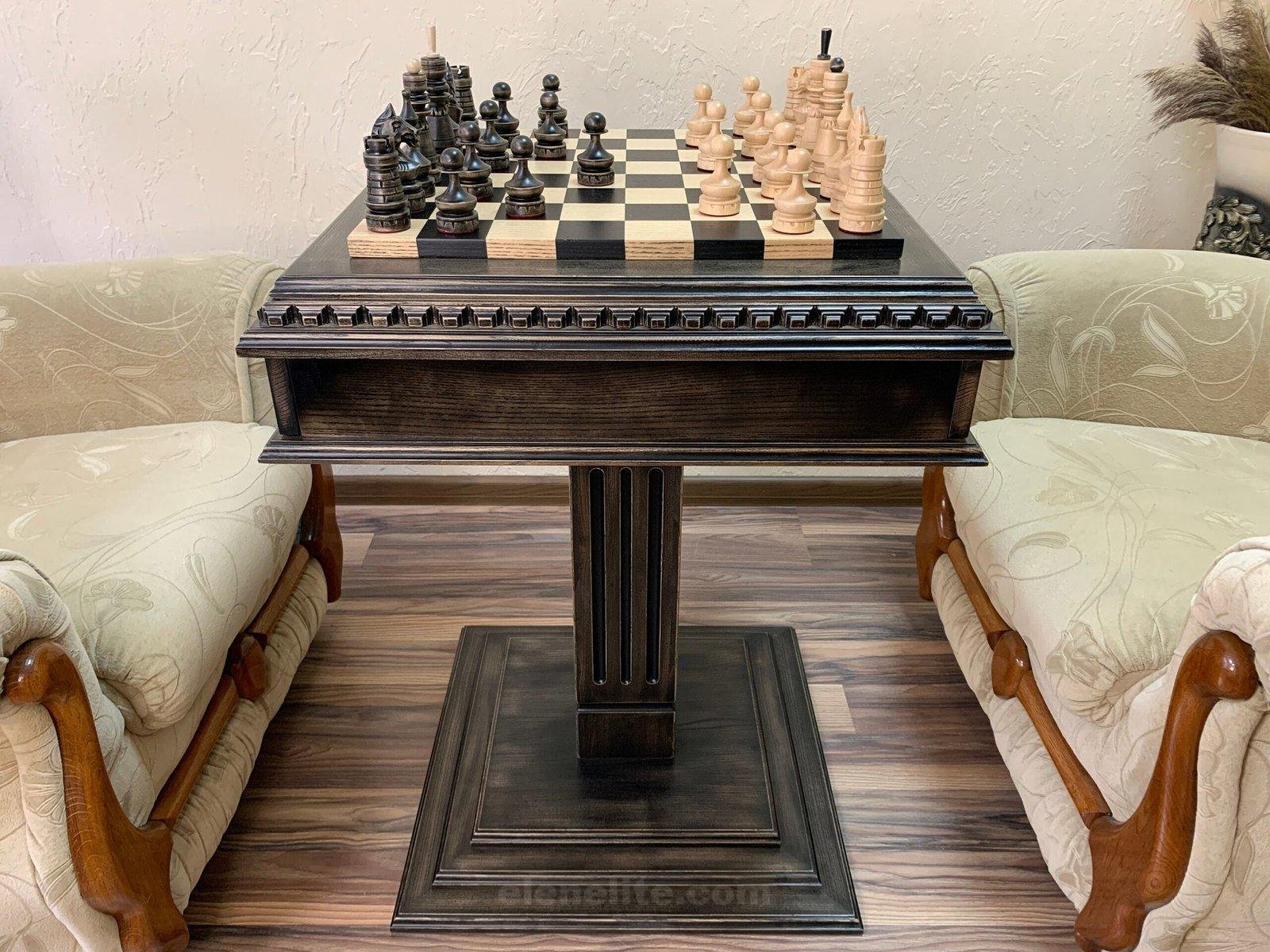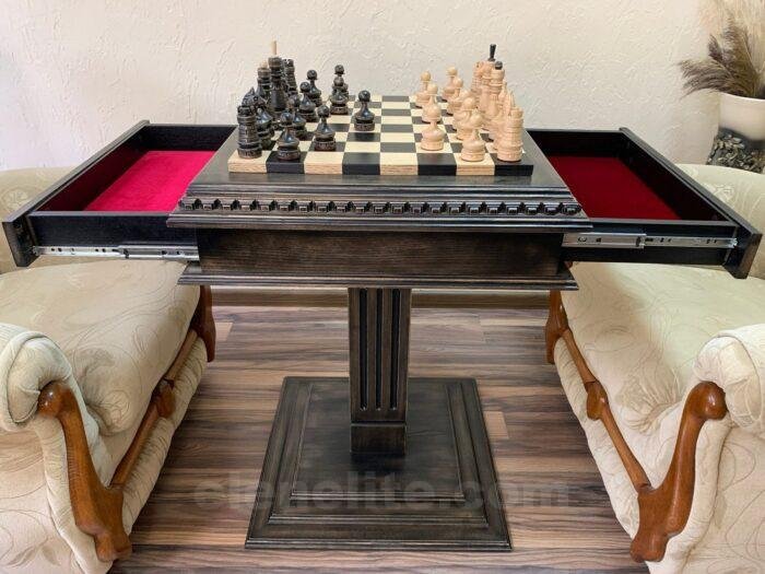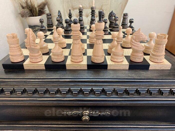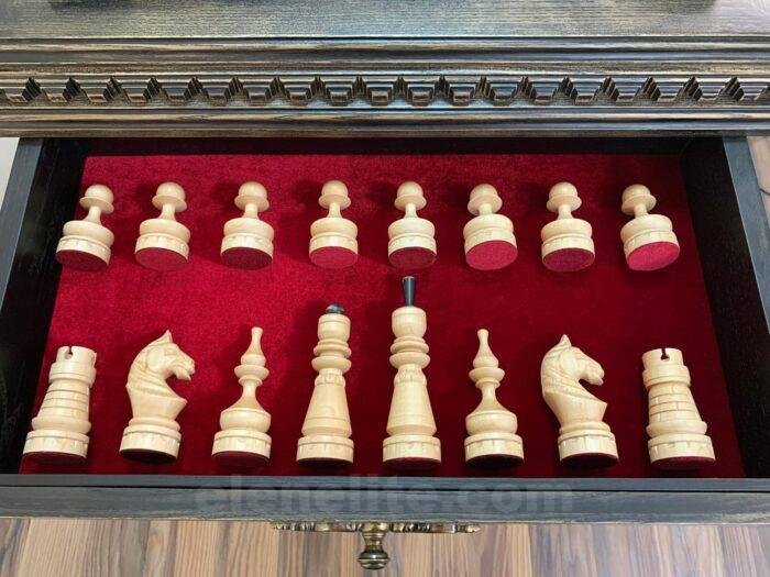DESIGN: the board is equipped with 2 drawers for storing chess pieces, the chess pieces are made in a classic style; exclusively designed by our “Elen Elite” craftsmen