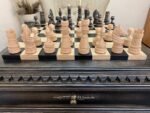 Chess set with elegant ash table with drawers and classic handcrafted maple pieces. Style, convenience and premium quality in one set.