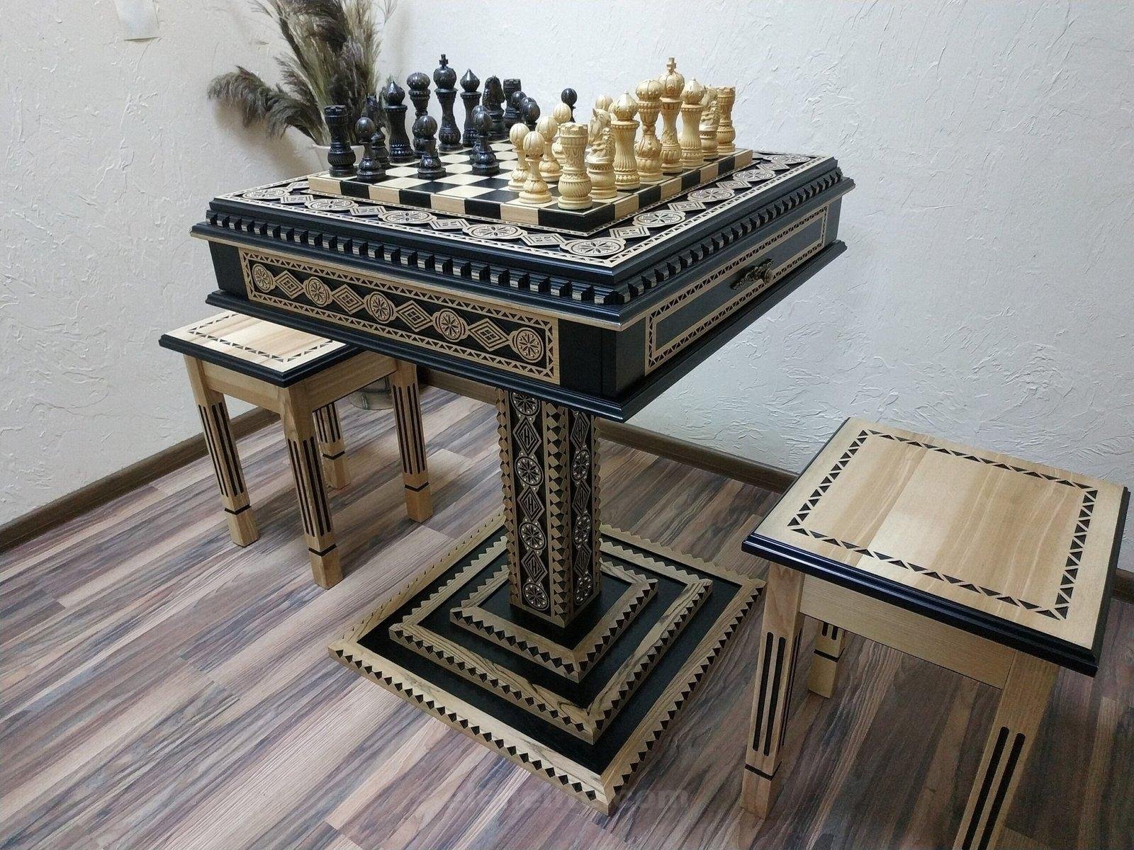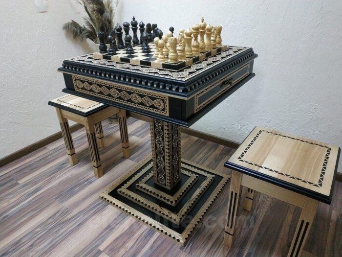 A luxurious handcrafted chess set: a table with carvings and beads, two drawers for storing pieces, elegant stools and chess pieces in the Elegant Classic style. Game and aesthetics in one.