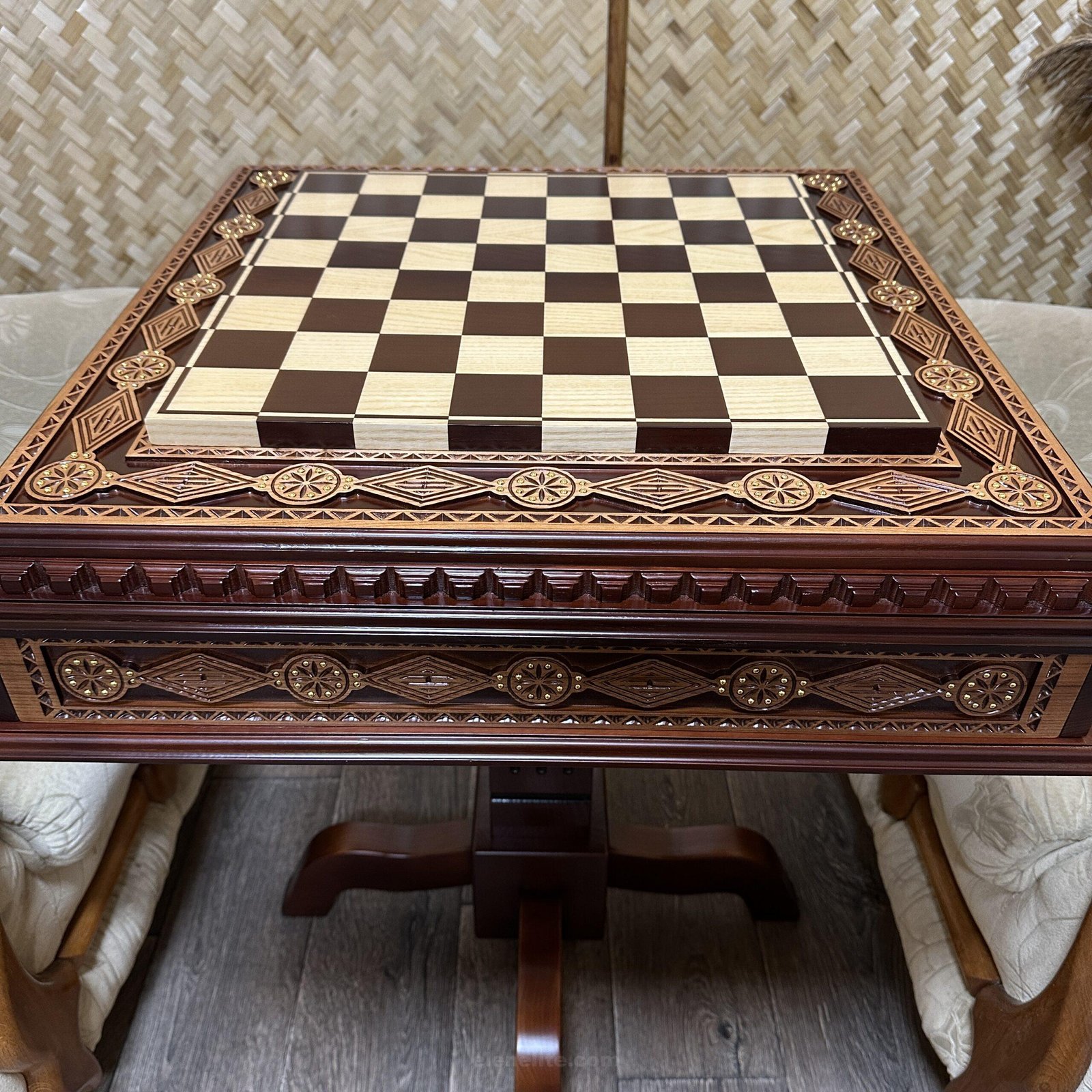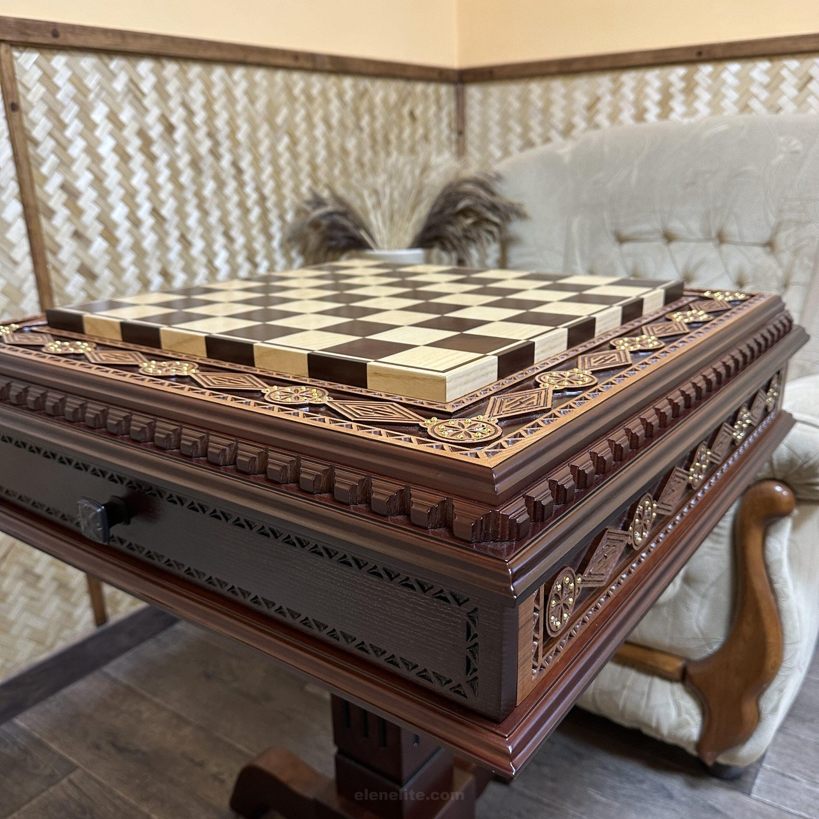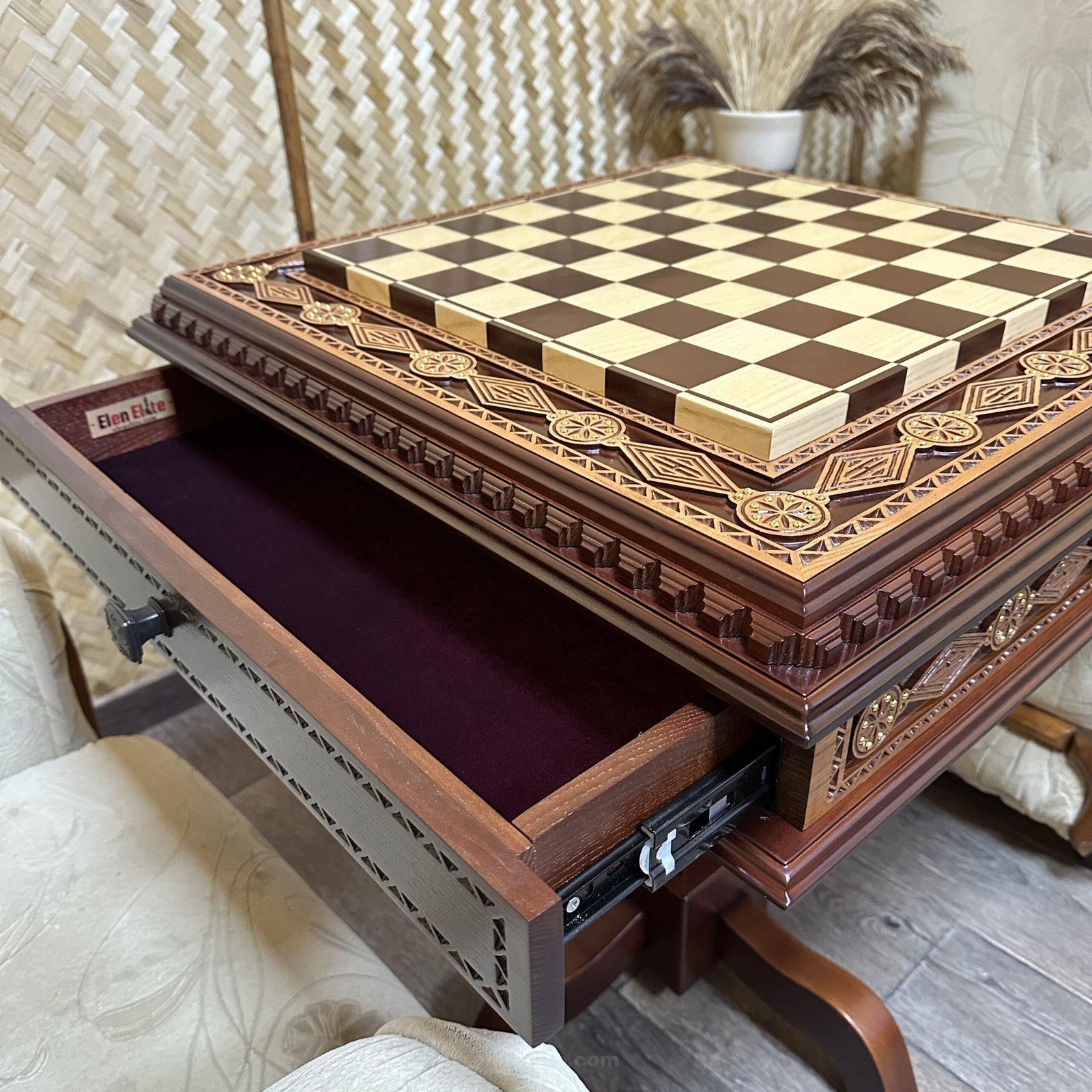 The tabletop is adorned with detailed carvings, while decorative bead inlay adds a unique artistic touch. The table features built-in drawers, the interiors of which are lined with soft velvet to carefully store chess pieces and protect them from damage.
