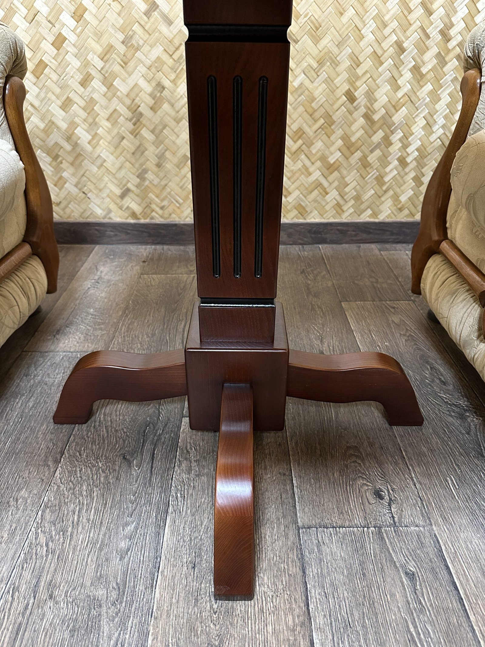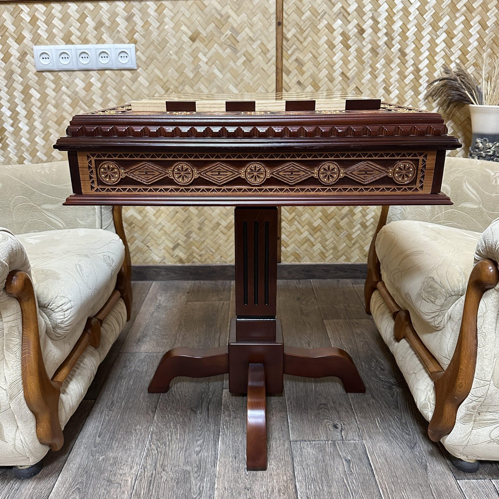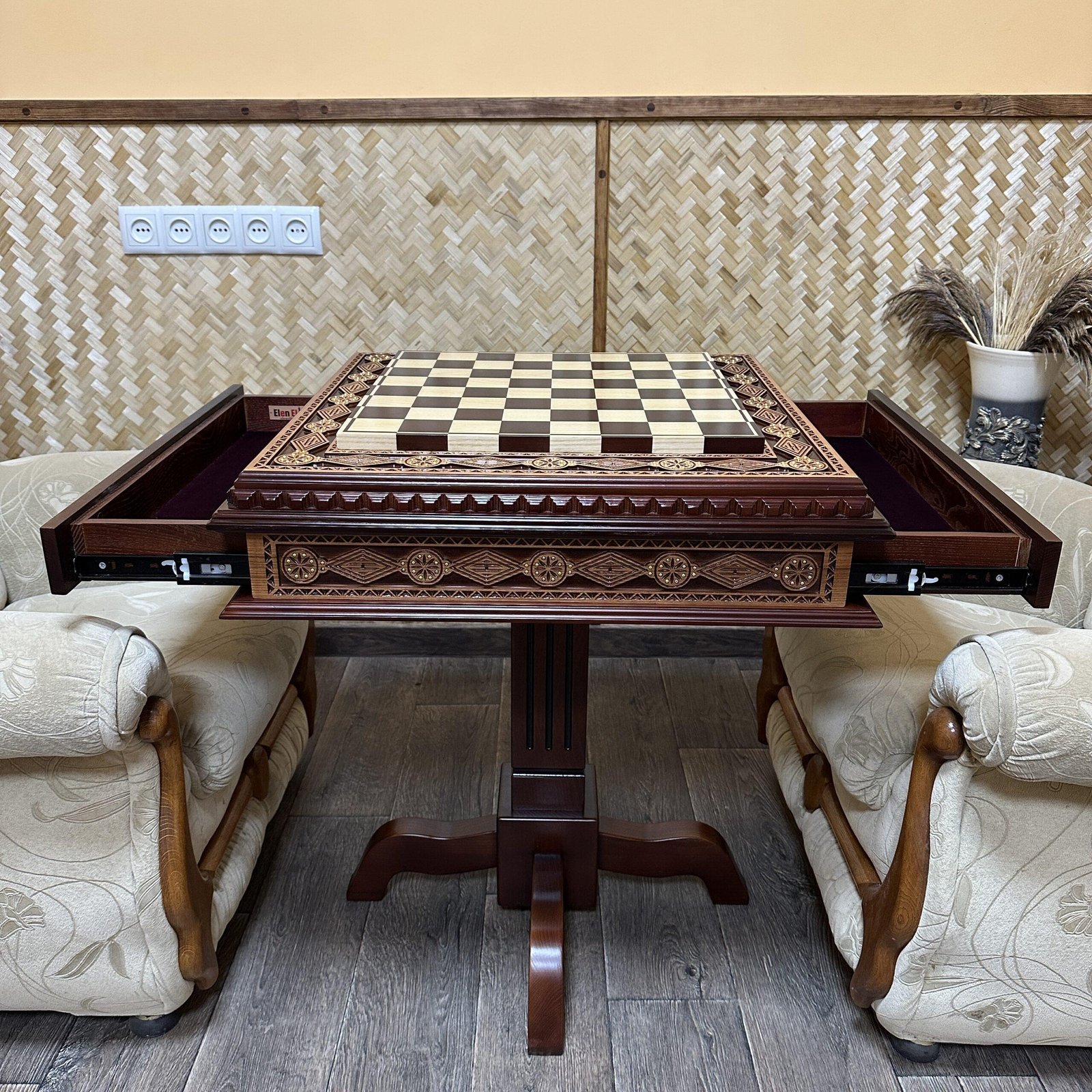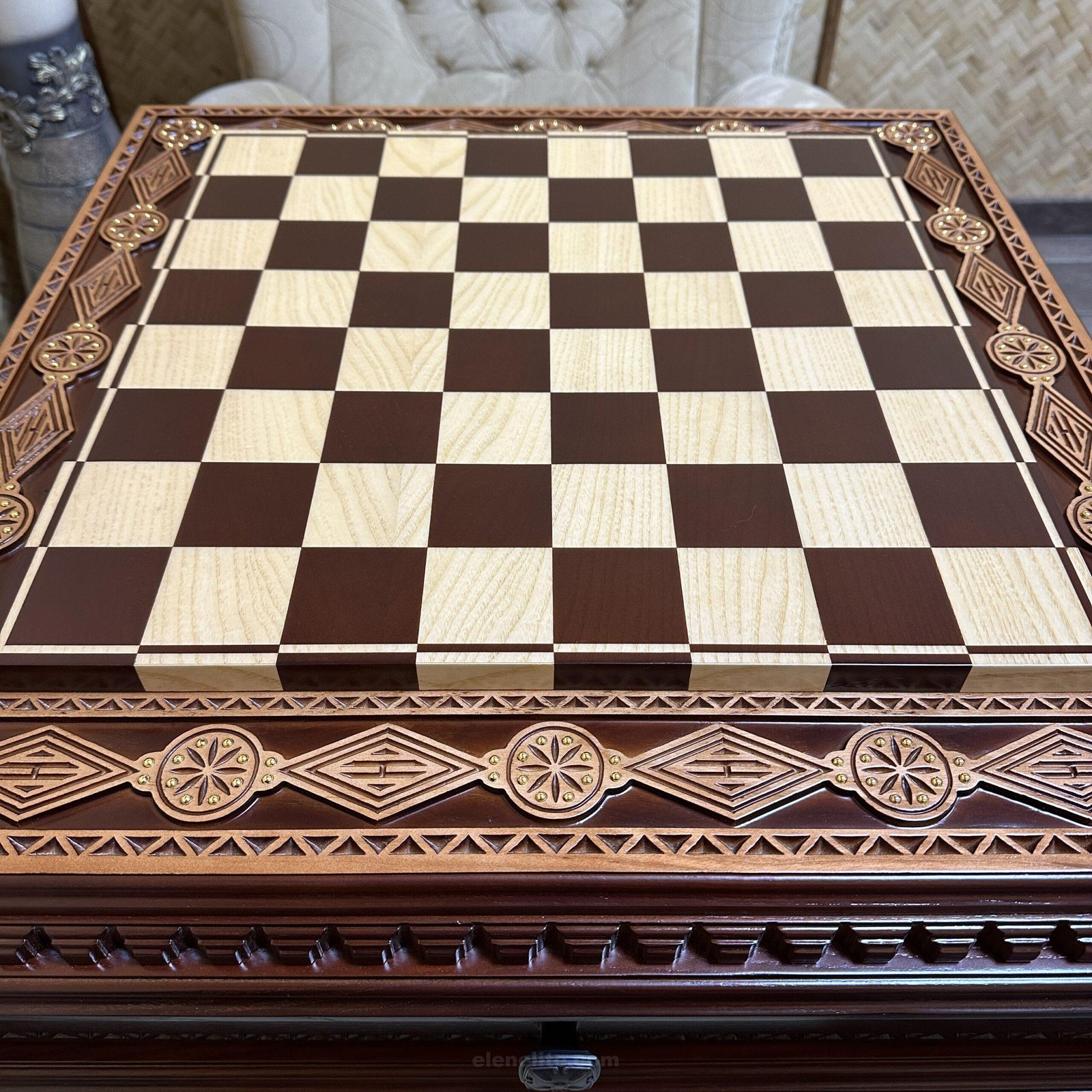 The tabletop is adorned with detailed carvings, while decorative bead inlay adds a unique artistic touch. The table features built-in drawers, the interiors of which are lined with soft velvet to carefully store chess pieces and protect them from damage.