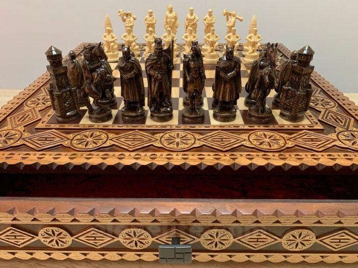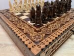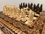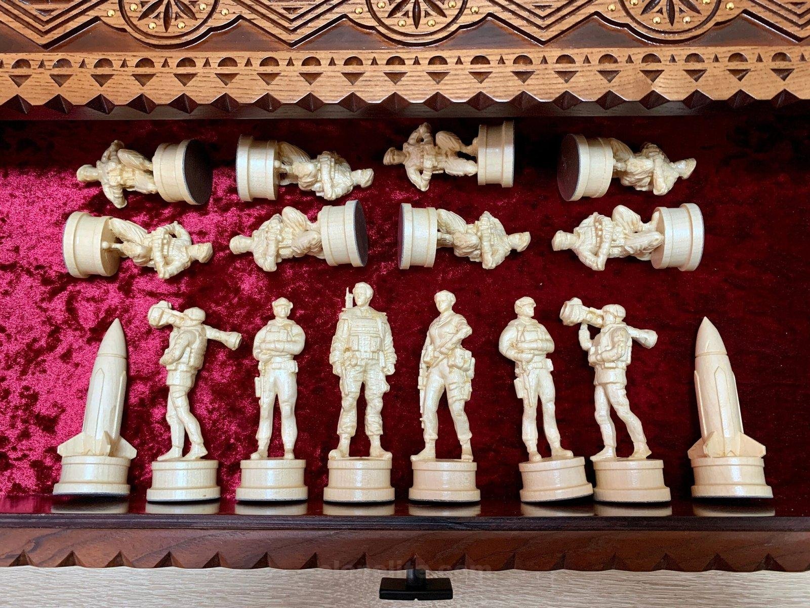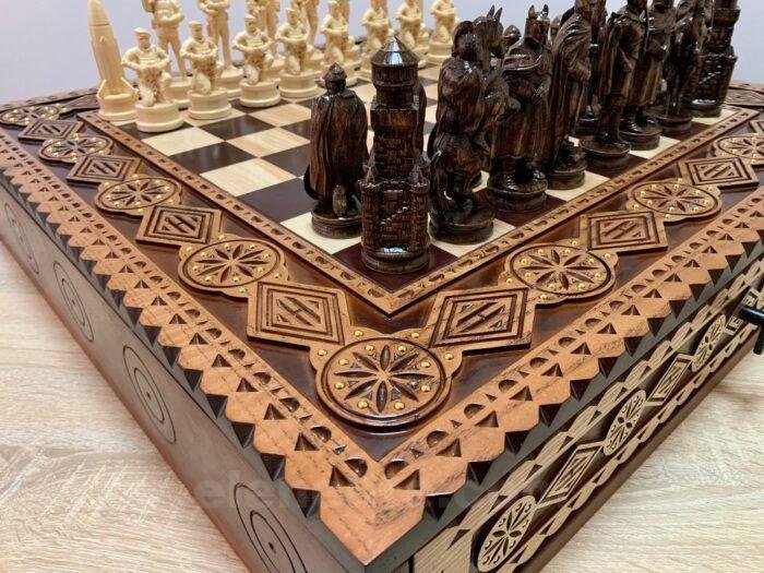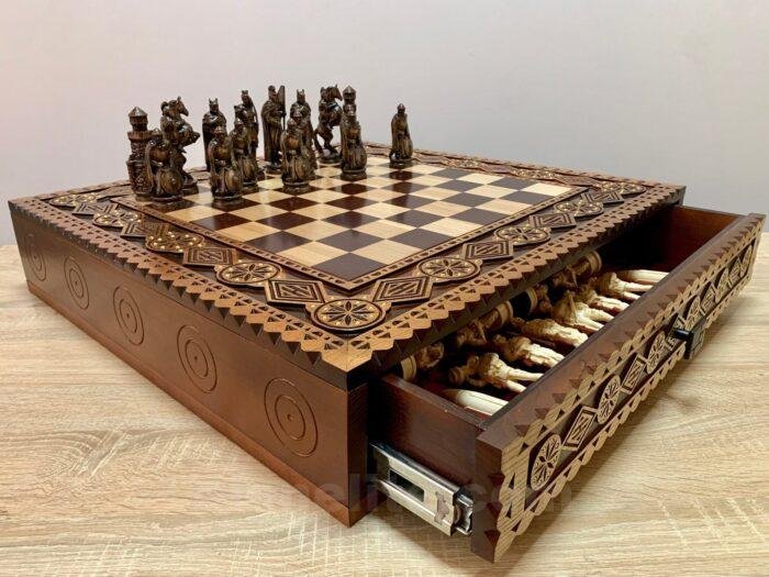We present you a unique chess set, developed in a special design. The ash board in a warm brown color is decorated with carvings and neat bead inlay. Two pull-out drawers with a velvet lining provide convenient storage of pieces. The set includes 32 chess pieces with premium detailing: 16 knights in a classic style and 16 pieces of the heroes of Ukraine – Taras Shevchenko and Lesya Ukrainka, each with carefully carved clothes, weapons and historical details, turning the game into a real artistic composition.