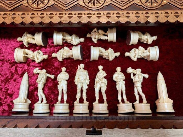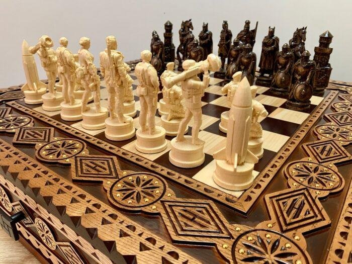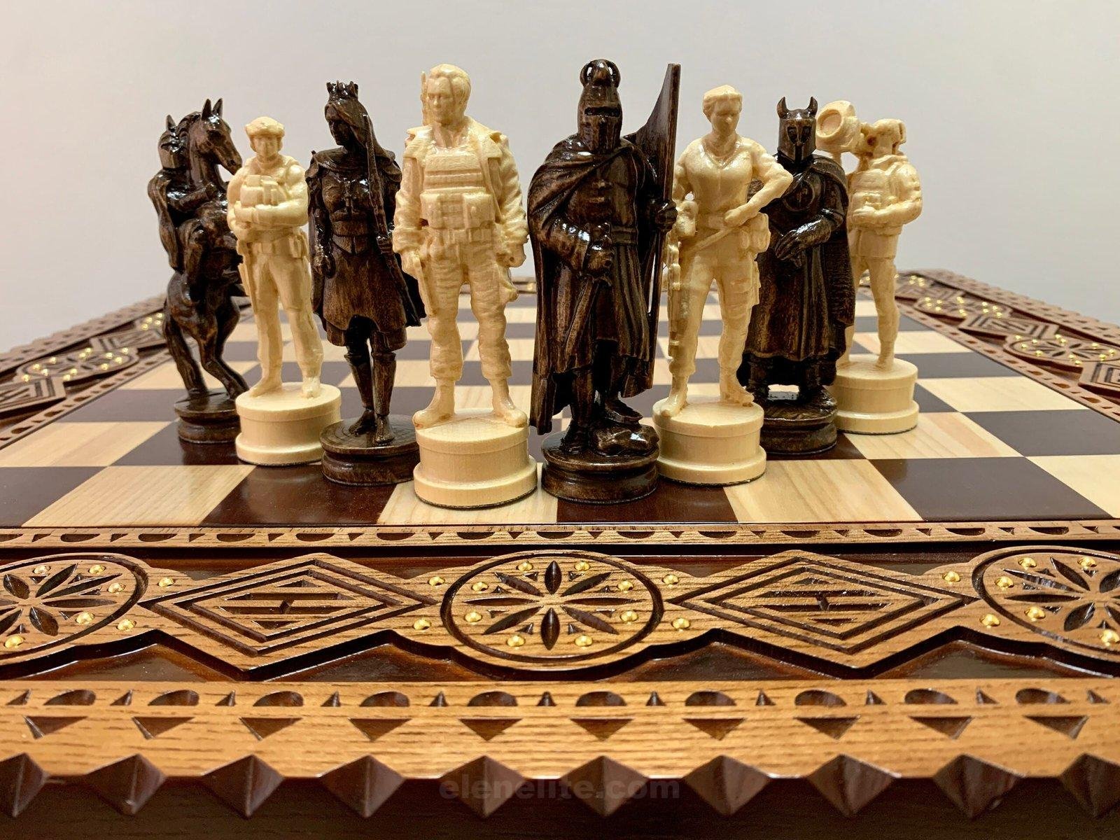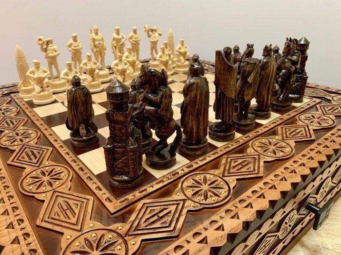 DESIGN: the chess board is equipped with 2 drawers for storing chess pieces and is inlaid with a beads; 16 pieces – Ukrainian heroes: Taras Shevchenko, Lesya Ukrainka, military and 16 pieces – Knights; exclusively designed by our “Elen Elite” craftsmen.