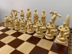An elegant chess set made of ash with brown tones and premium velvet-lined drawers. 32 highly detailed pieces: knights and heroes of Ukraine – T. Shevchenko and L. Ukrainka.