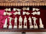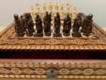 COLOR: chess board in reddish-brown, light brown, beige; chess pieces – black patina, beige