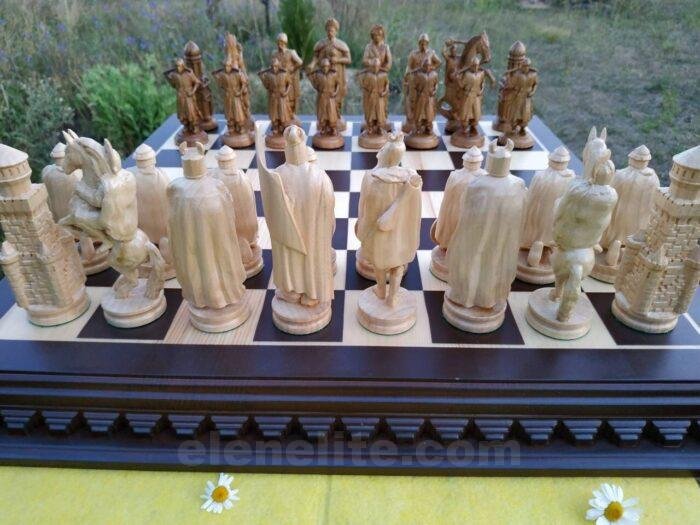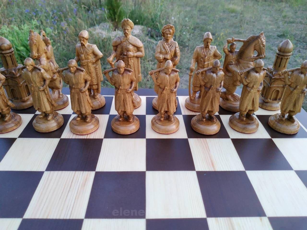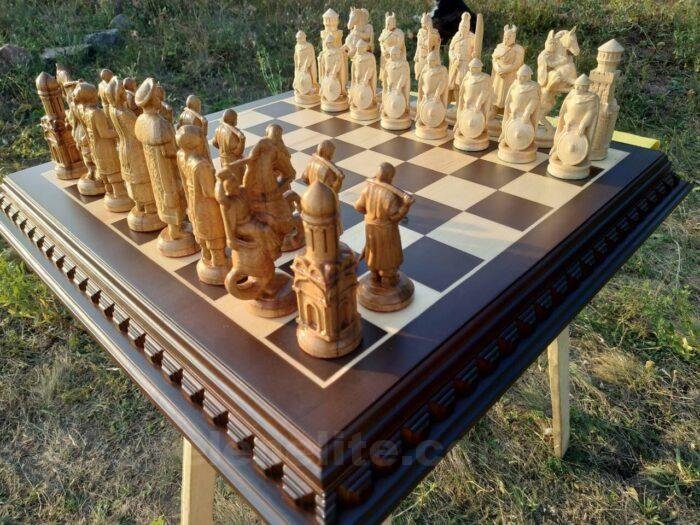 Handcrafted chess: classic ash board and unique chess pieces in the form of knights and Cossacks, created by masters with unique skill.