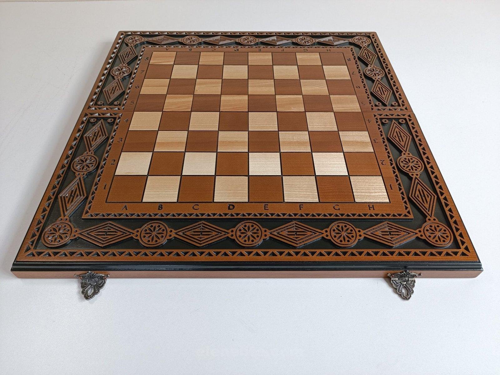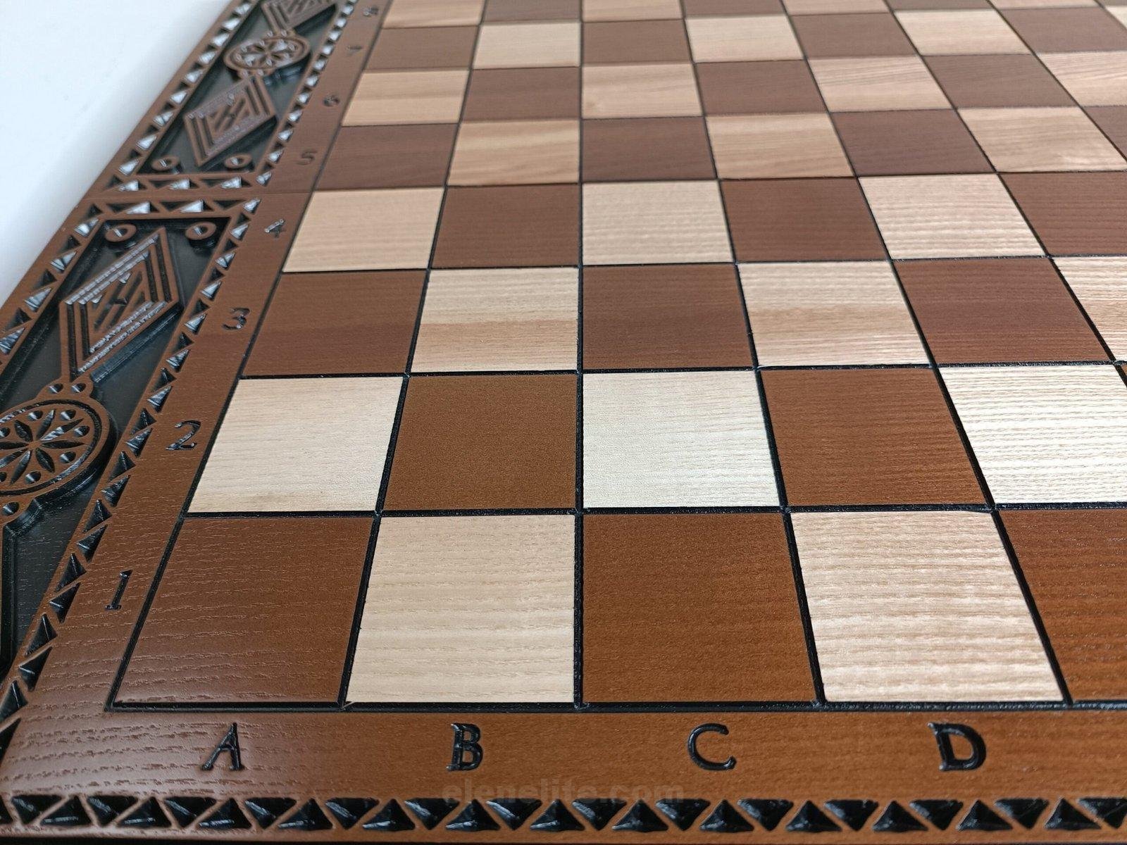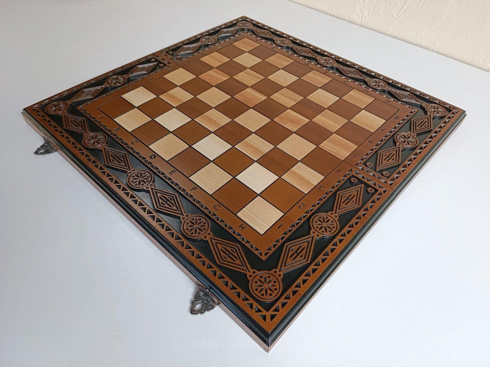 DESIGN: multifunctional folding board 3 in 1: chess, checkers and backgammon, carved patterns and markings; exclusively designed by our “Elen Elite” craftsmen.