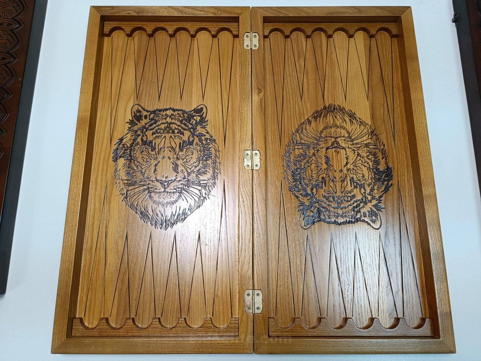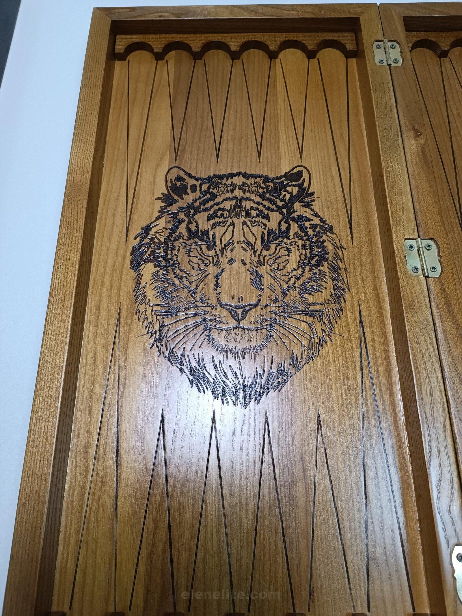 Folding Board 3 in 1: Chess, Checkers and Backgammon. Made of ash, decorated with carvings, with a bright image of a tiger inside and a field for playing backgammon.