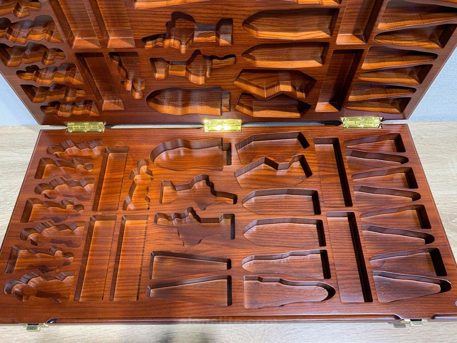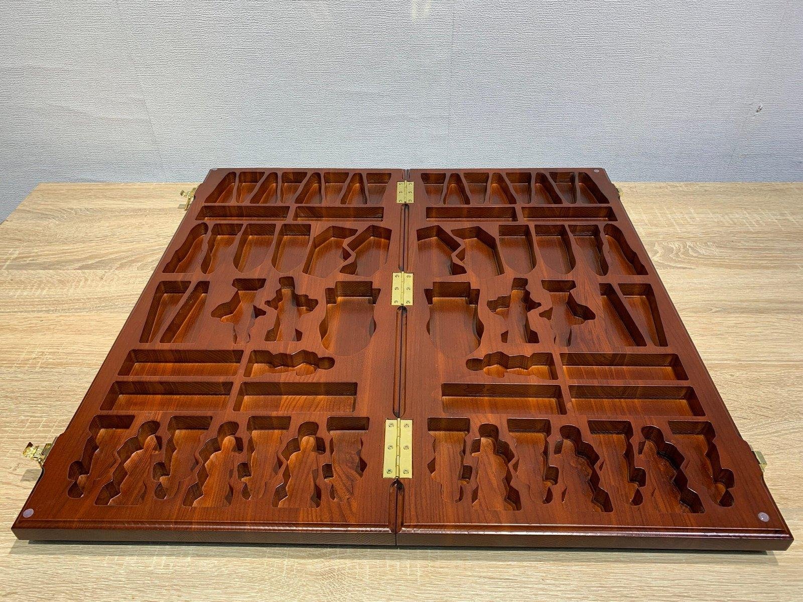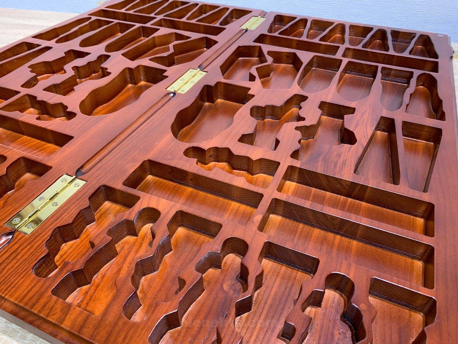 The photo shows an example of a chess board with storage for a set of “Battle of Thrones & Knights” chess pieces. At your request, we can design storage for any chess pieces!