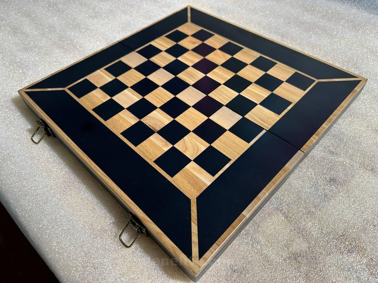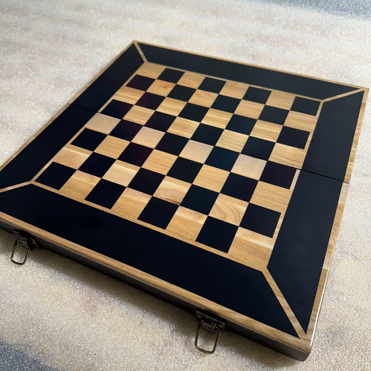 The interior is lined with soft velvet, ensuring the chess pieces are carefully stored and protected from damage. Premium hardware underscores the high quality of the board, guaranteeing reliability and durability.